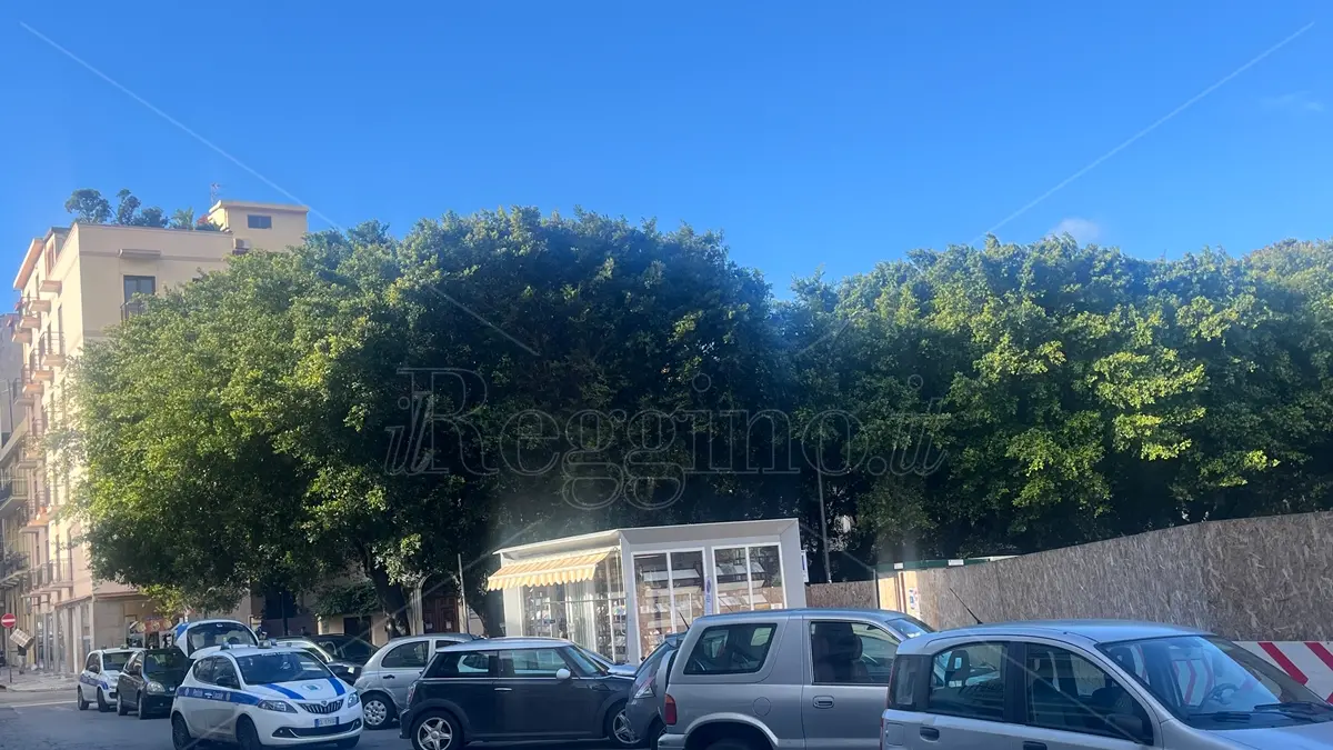 Due pattuglie della polizia municipale in azione per sgombrare l’accesso al cantiere degli scavi di piazza Garibaldi, nel centro storico di Reggio Calabria, fermo da mesi.
