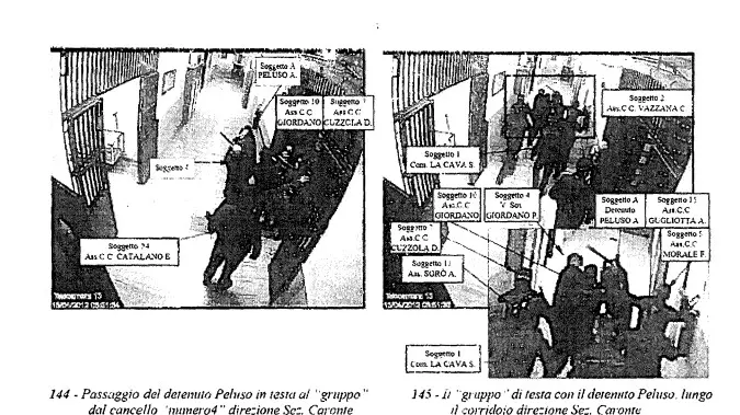 Sono attimi. Secondi di violenza raccontati dalle immagini delle telecamere, che vedono il detenuto camminare nel corridoio «in testa al “gruppo”, spinto e colpito, mezzo sfollagente, da alcuni Operatori della Polizia Penitenziaria.