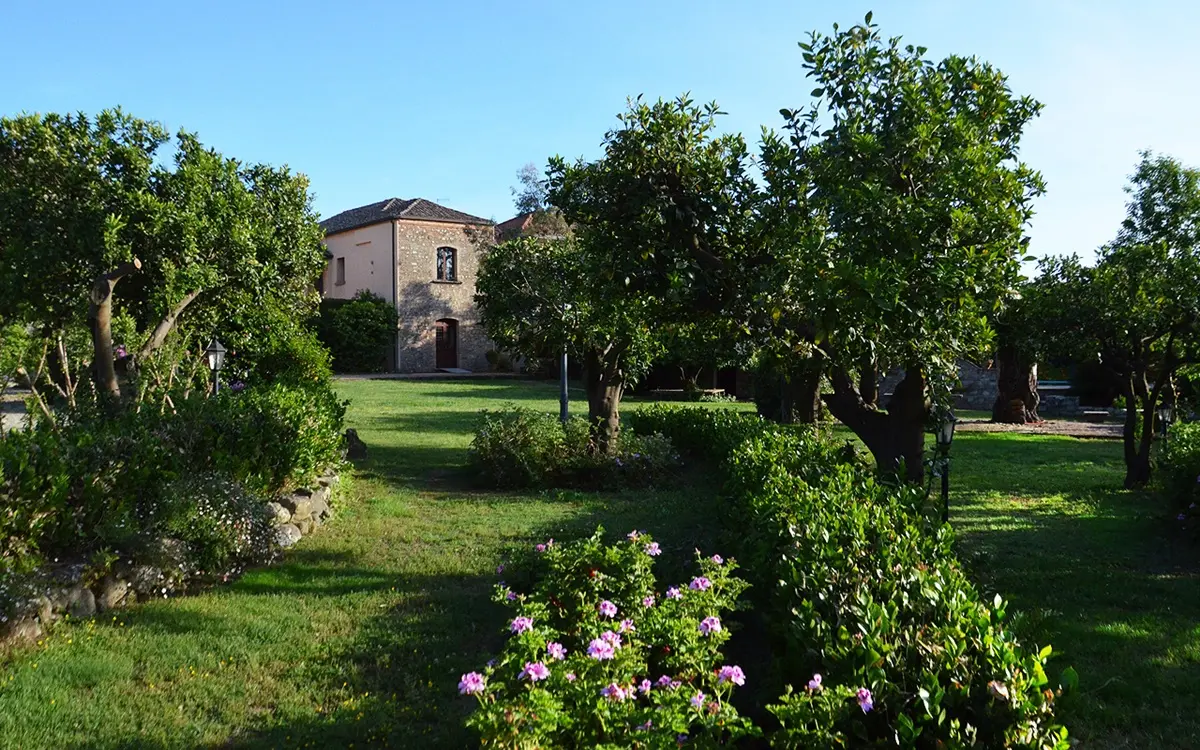 Il Citrus Aurantium, localmente chiamato “Arancio di spina”, che rappresenta il solido legame con il territorio ed è riferimento botanico e storico su cui si sviluppa l’intera idea del giardino di Villa Zerbi. Il nucleo centrale si compone invece, di armacie, delimitanti il lieve declivio, segnate da continue linee di Ruscus Racemosus e dalla presenza di alcuni melograni (Punica granatum). Accanto al fontanile in pietra e alla vasca piscina, c’è il Quercus robur, adiacente ad un prato di rose moschate e una bordura di Nepeta cataria. Una collinetta di Pelargonium geraniaceae (Royal Quercus) e Salvia microphilla sovrasta un’ampia siepe di macchia mediterranea. In fondo al giardino un angolo di grandi succulente, fra le quali Cereus peruvianum e un Opuntia falcata, che affianca due sculture lignee modellate dalla natura, i tronchi maestosi di due olivi secolari bruciati da un fulmine.