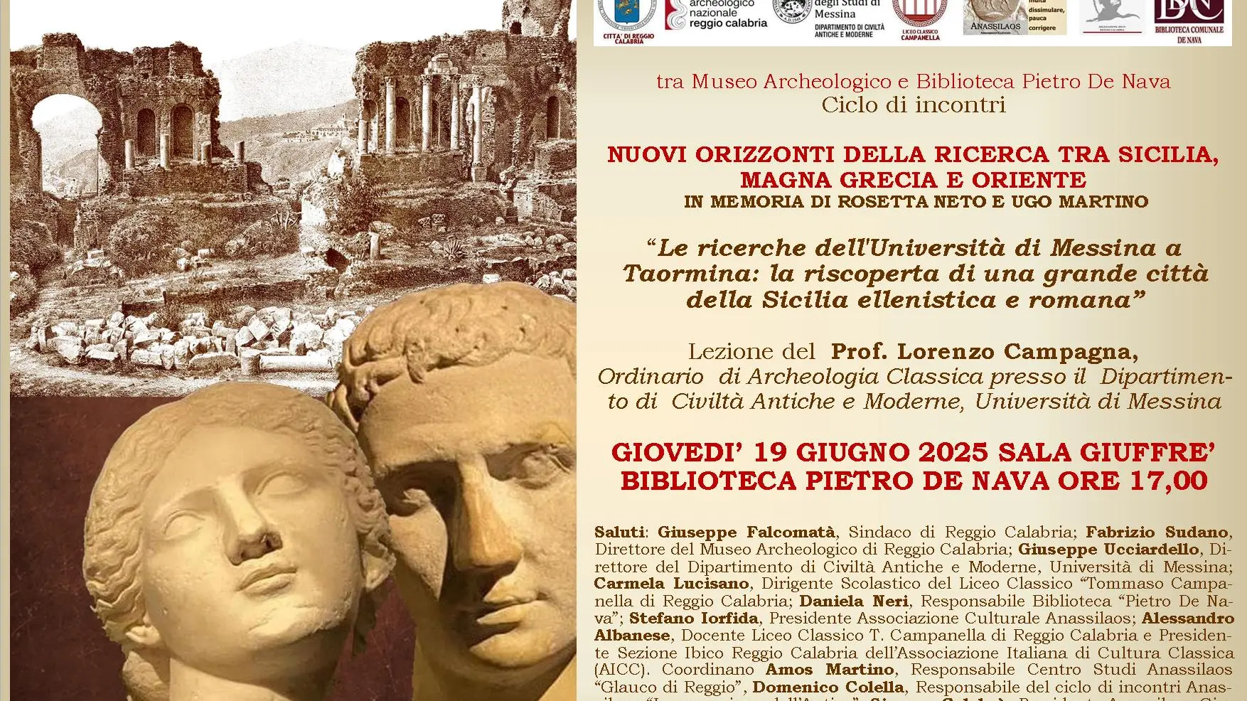 Proseguono gli incontri promossi dall’Associazione Culturale Anassilaos, congiuntamente con il Museo Archeologico e la Biblioteca Pietro De Nava, sul tema “Nuovi orizzonti della ricerca tra Sicilia, Magna Grecia e Oriente” patrocinati dal Comune di Reggio Calabria, nell’ambito della “primavera Reggina”, dal Dipartimento di Civiltà Antiche e Moderne dell’Università di Messina, dalla Sezione Ibico Reggio Calabria dell’Associazione italiana di Cultura Classica (AICC) e dal Liceo Classico “Tommaso Campanella di Reggio Calabria dedicati alla memoria di due illustri docenti di questo medesimo Liceo (Rosetta Neto e Ugo Martino).