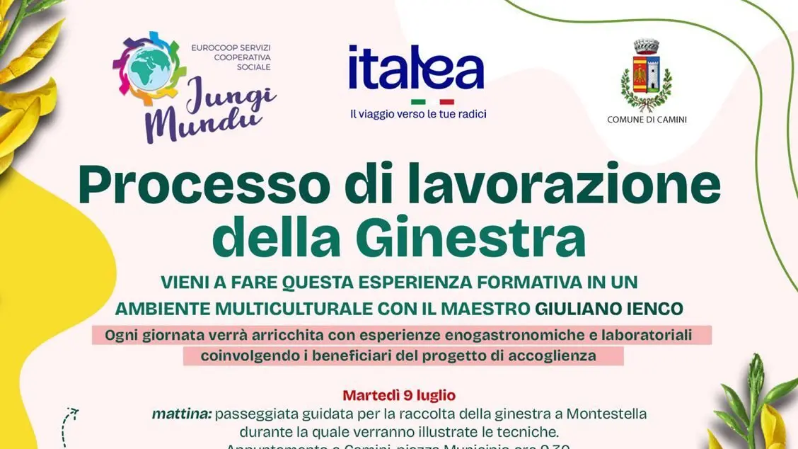 Una pianta dal fascino perenne come la ginestra e la bellezza della sua lavorazione e dei diversi impieghi al centro del progetto laboratoriale ideato e promosso da Eurocoop Jungi Mundu, in collaborazione con Comune di Camini e Italea, che dal 9 al 13 luglio 2024 offrirà ai partecipanti l’opportunità di un’esperienza altamente formativa in un ambiente multiculturale sotto la guida del maestro Giuliano Ienco. Un’occasione unica per riscoprire tradizioni e tecniche artigianali antiche.