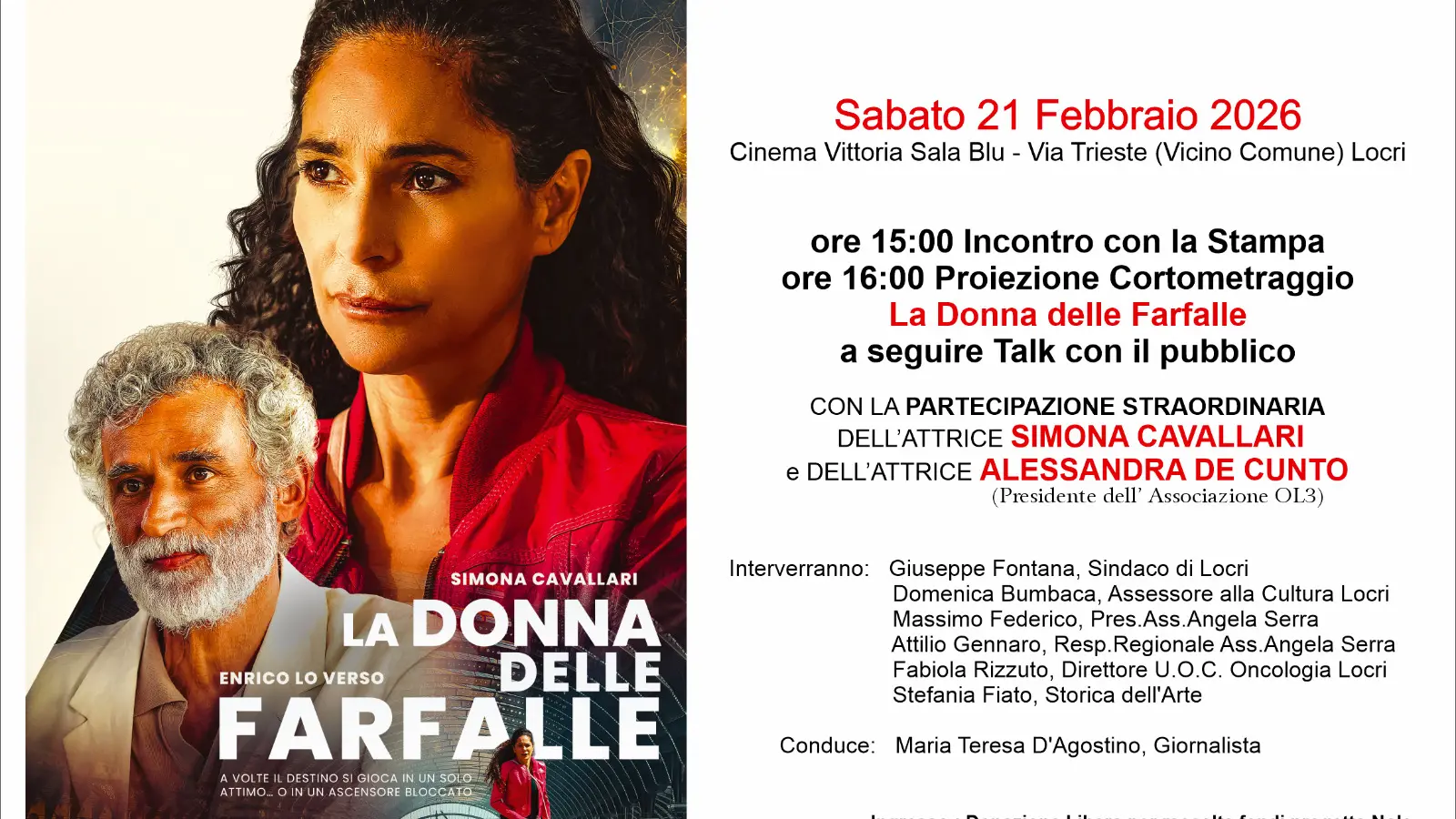 La lotta contro la malattia, la resilienza, la rinascita. Sabato 21 febbraio 2026, alle ore 16.00, al Cinema Vittoria – Sala Blu di Locri, si terrà la replica della premiere del film “La donna delle farfalle”, realizzato grazie alla collaborazione fra l’associazione OL3 e Dorado Pictures, scritto e diretto da Luca Fortino, interpreti principali Simona Cavallari ed Enrico Lo Verso, e sostenuto dall’Associazione “Angela Serra – Sezione Locride”.