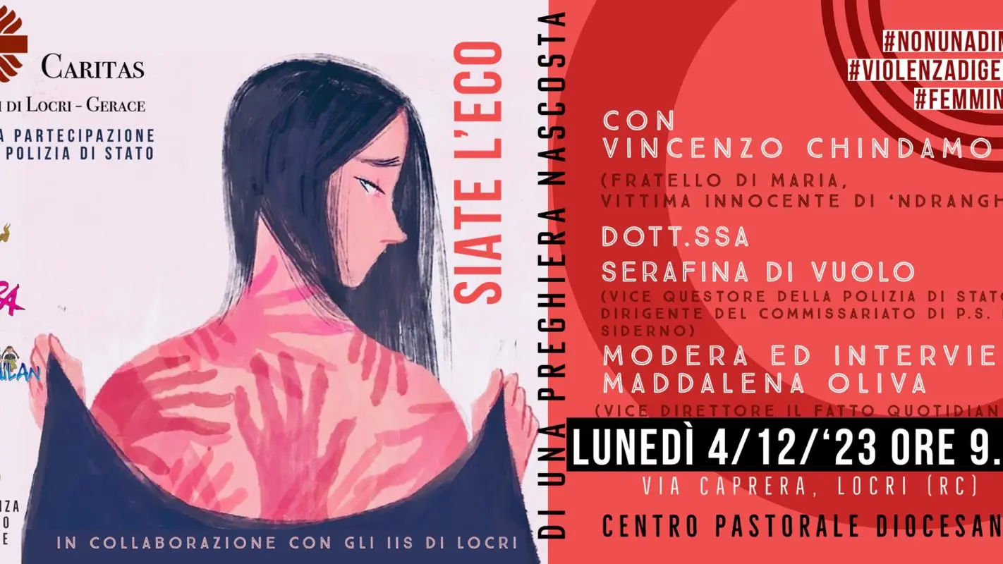 Con l’intento di rafforzare il proprio impegno nel contrasto alla violenza di genere, la Caritas diocesana di Locri-Gerace, in collaborazione con il Coordinamento Libera Locride, l’Associazione Don Milani e gli Istituti d’Istruzione Superiore cittadini, il patrocinio della Presidenza del Consiglio Comunale di Locri e con la partecipazione della Polizia di Stato, lunedì 4 dicembre, alle ore 9:30, presso il Centro Pastorale Diocesano sito in via Caprera, a Locri, organizza l’incontro Siate l’eco di una preghiera nascosta.