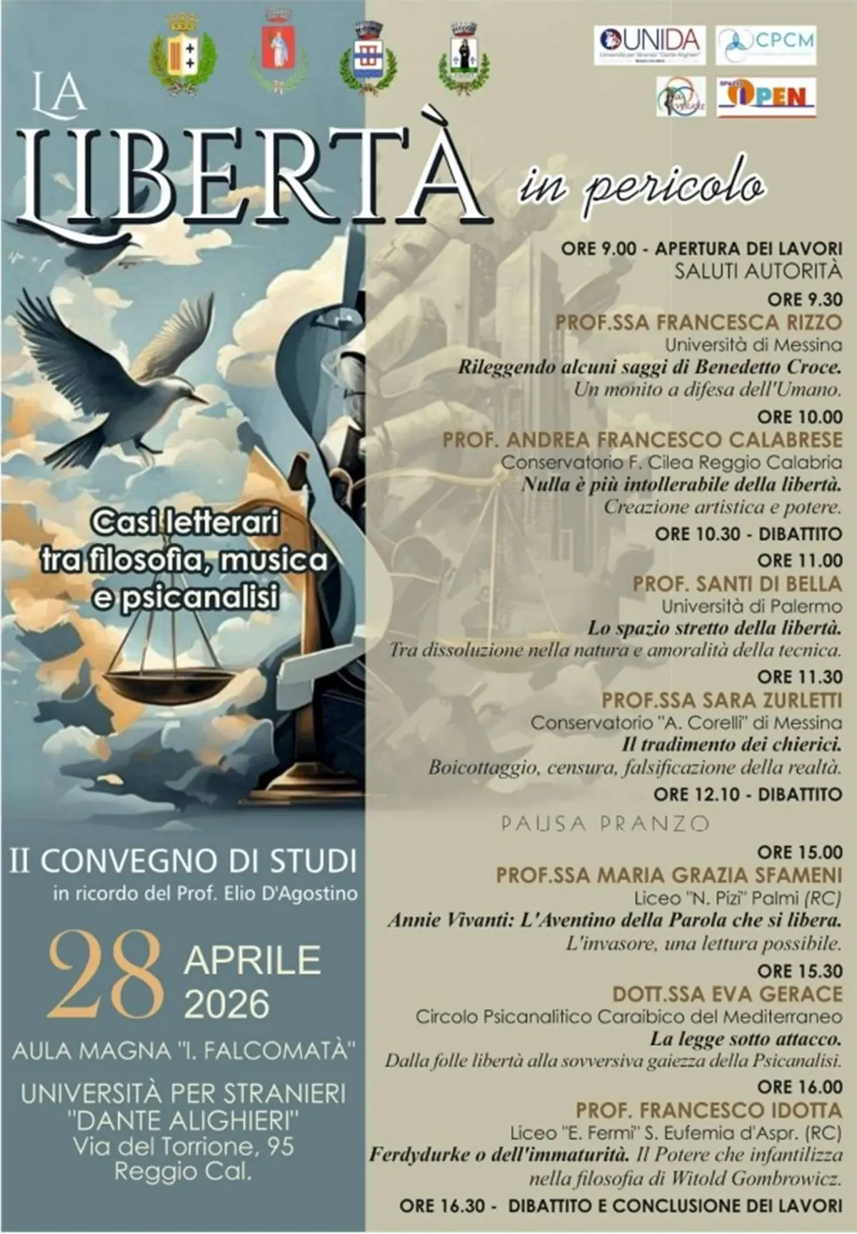 “La libertà in pericolo. Casi letterari tra filosofia, musica e psicanalisi” è il titolo del convegno che si terrà, in memoria del professore Elio D’Agostino, presso l’aula Magna “I. Falcomatà” dell’università Dante Alighieri di Reggio Calabria, martedì 28 aprile 2026, con inizio alle ore 9. Sarà un'occasione importante per riflettere sulla libertà e sui pericoli che la minacciano, con interventi di docenti e professionisti nei settori della Filosofia, della Psicanalisi, della Musica e della Letteratura. Un’opportunità per ampliare il dialogo tra il centro e la provincia della nostra realtà territoriale. Di seguito il programma:
