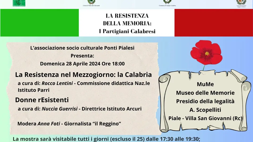 Domenica 28 aprile, alle ore 18:00 nell’ambito della Mostra “La Resistenza della Memoria: I Partigiani Calabresi”, organizzata dall’ Associazione socio culturale Ponti Pialesi, si terrà al MuMe – Museo delle Memorie di Piale a Villa San Giovanni, il terzo appuntamento La Resistenza nel Mezzogiorno: la Calabria; un momento di approfondimento, con aspetti inediti sulla liberazione d’Italia, curato da Rocco Lentini della Commissione didattica dell’Istituto nazionale Ferruccio Parri che, attraverso una serie di documenti e filmati d’epoca, offre una rilettura delle vicende legate allo sbarco Alleato in Continente –Operazione Baytown– del 3 settembre 1943.