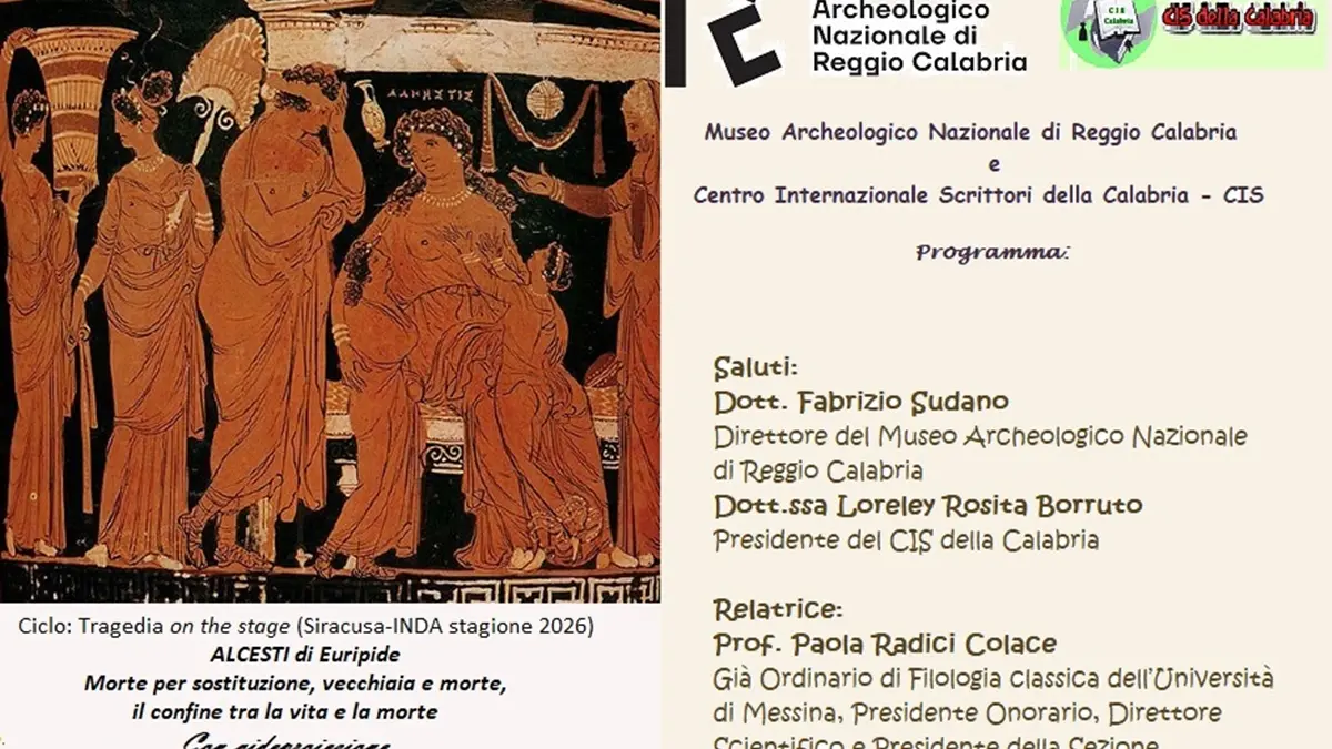 Nell’ambito degli incontri promossi dal Museo Archeologico Nazionale di Reggio Calabria e dal Centro Internazionale Scrittori della Calabria, venerdì 20 febbraio 2026, alle ore 17, nella Sala conferenze dello stesso Museo, nell’ambito del ciclo Tragedia on the stage (Siracusa-INDA stagione 2026) sarà proposta “Alcesti di Euripide. Morte per sostituzione, vecchiaia e morte, il confine tra la vita e la morte” da rivedere al teatro Greco di Siracusa.
