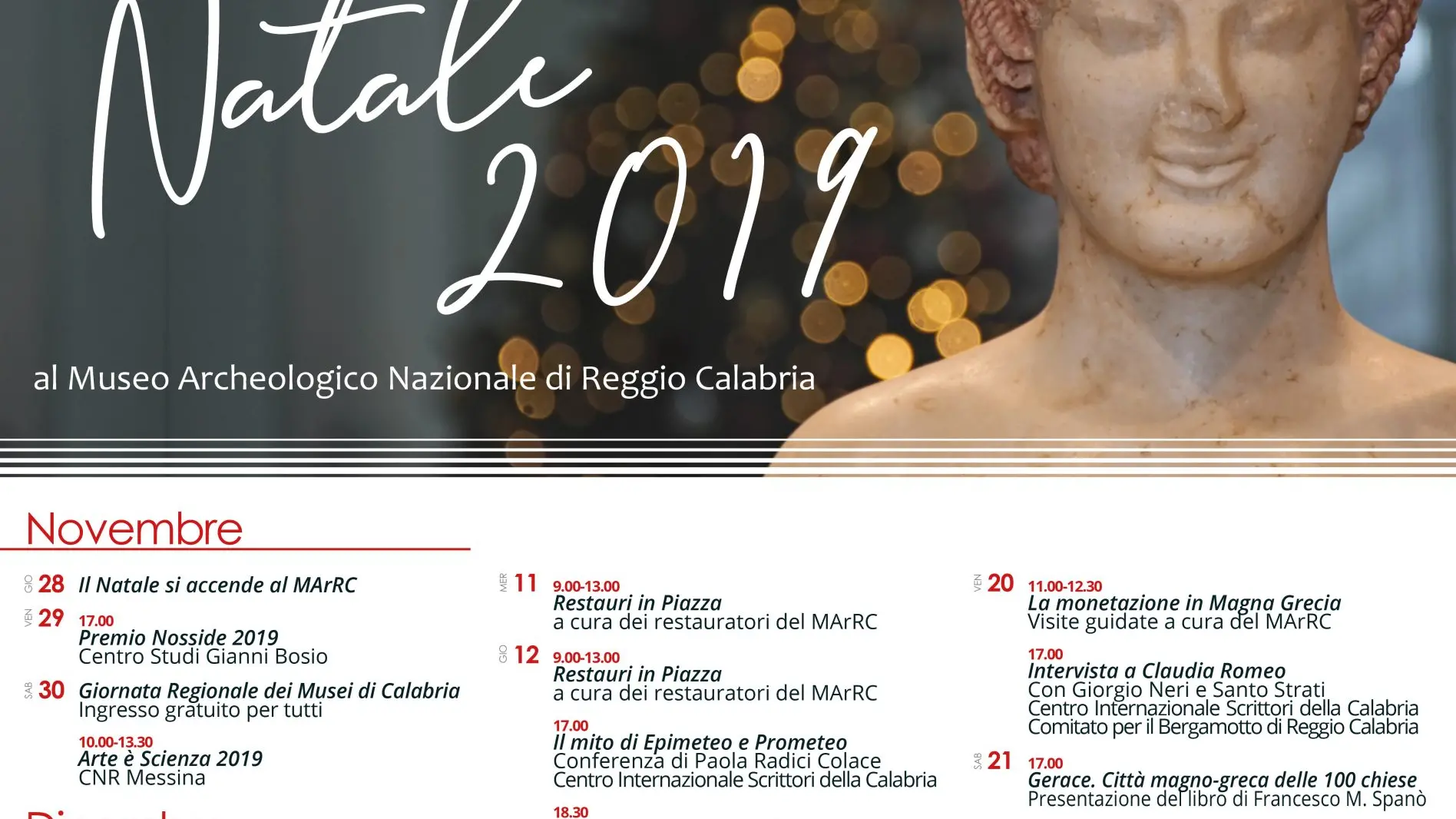 «Siamo contenti della qualità e quantità di eventi in programma al Museo a partire da questo fine settimana – commenta il Direttore Carmelo Malacrino. Iniziative che sanciscono le sinergie inclusive ormai consolidate con le associazioni e gli enti del territorio reggino, e che testimoniano la voglia di fare rete e di ampliare l’offerta culturale in città. E soprattutto di “riscaldare” l’atmosfera natalizia tra le sale del Museo. Non solo buona musica con le esibizioni musicali, ma anche eventi per i bambini, dibattiti, presentazioni di volumi scientifici e visite guidate programmate nei diversi livelli della collezione permanente».
