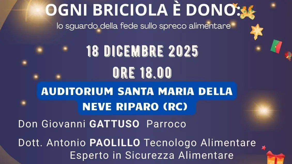 Giovedì 18 dicembre, alle ore 18:00, presso l’Auditorium Santa Maria della Neve di Riparo (Reggio Calabria), si terrà l’incontro pubblico dal titolo “Ogni briciola è dono. Lo sguardo della fede sullo spreco alimentare”, un appuntamento di riflessione, formazione e condivisione rivolto all’intera comunità, in particolare in prossimità del tempo natalizio.