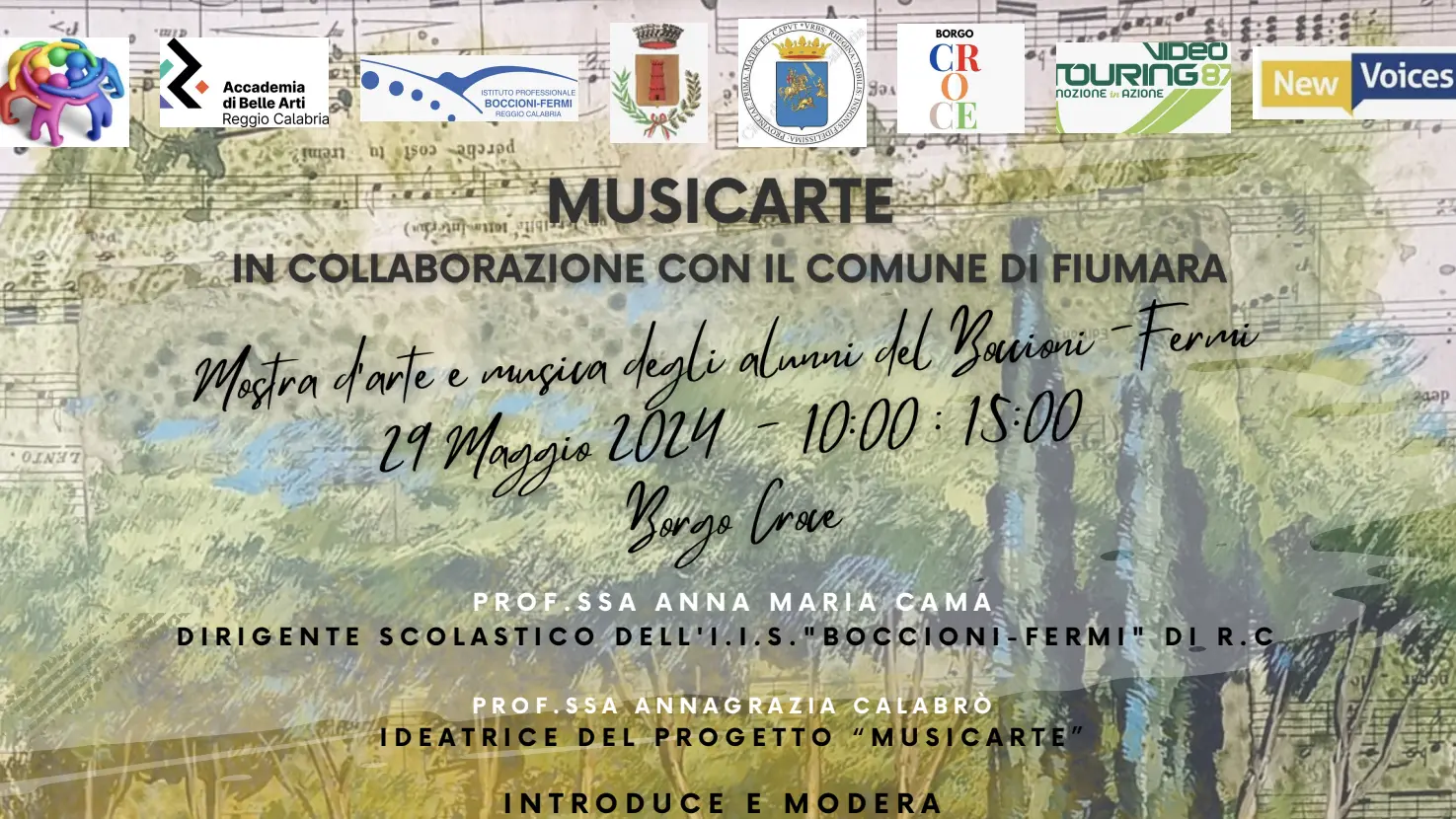 Approda il 29 maggio 2024 a Borgo Croce Musicarte, la mostra con i lavori realizzati dagli alunni dell’Istituto Boccioni-Fermi di Reggio Calabria; ad annunciarlo entusiasti la dirigente scolastica prof.ssa Anna Maria Cama, la prof.ssa Annagrazia Calabrò (ideatrice del progetto), la prof.ssa Santa Ielo (coordinatrice inclusione) e il sindaco di Fiumara Dott. Michele Filocamo.