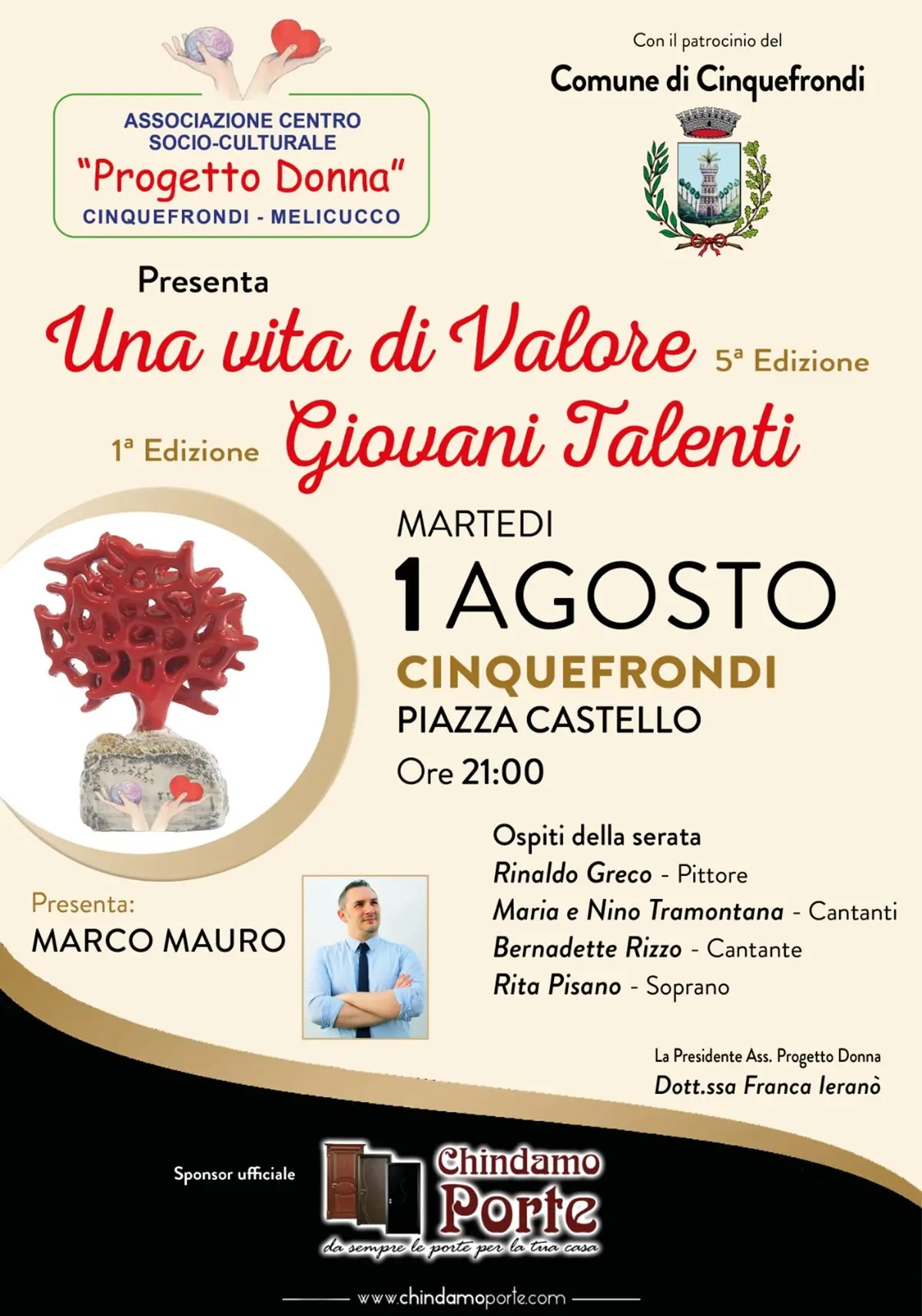 «I valori sono i desideri più profondi, sono i principi guida che ci orientano e motivano la nostra vita, portandoci ad andare nella direzione di ciò che è importante per avere un’esistenza piena e gratificante». Sono le parole dell’associazione Progetto Donna di Cinquefrondi Melicucco che ha organizzato per martedì 1 agosto a Pazza Castello a Cinquefronti alle ore 21.00, la manifestazione “Una vita di Valore”.