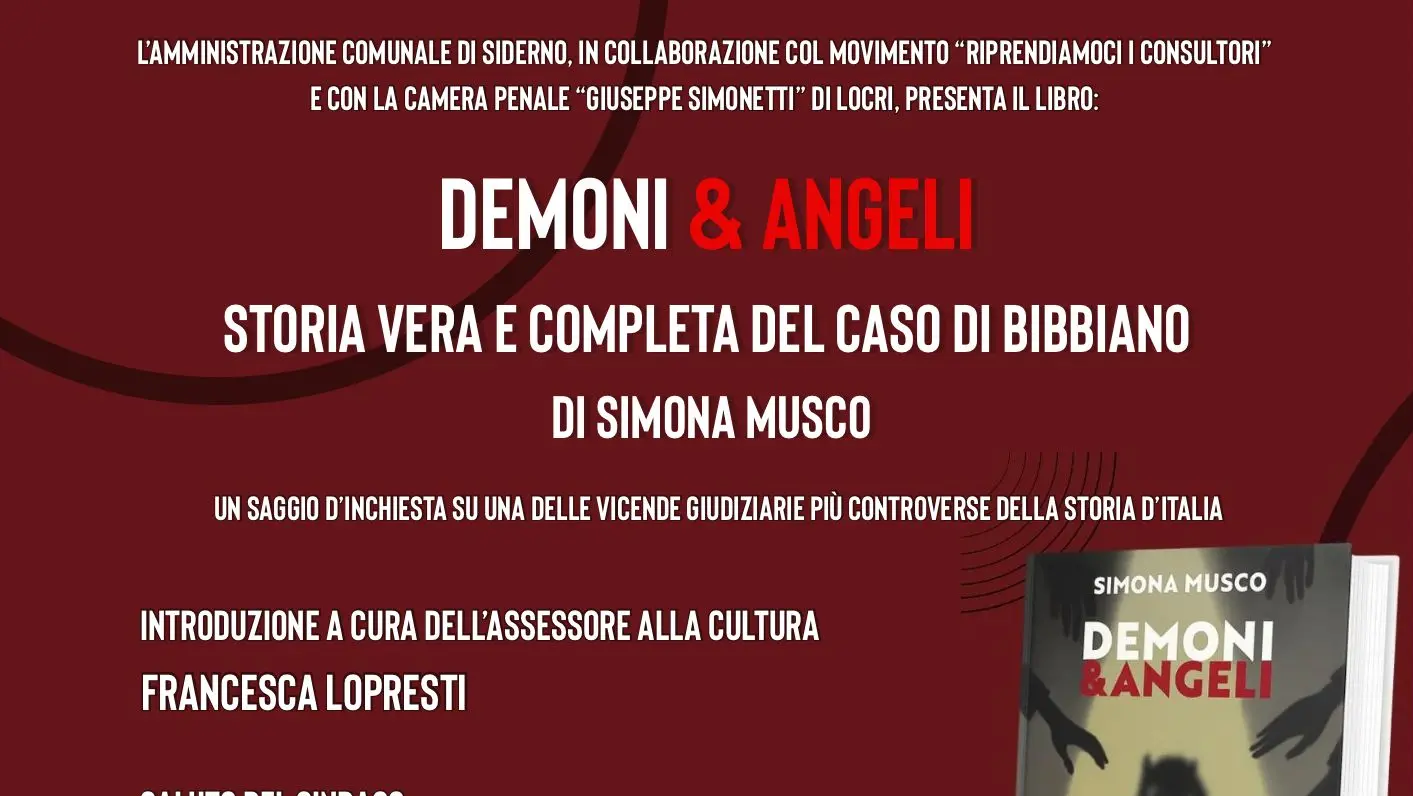 L’Amministrazione Comunale di Siderno ha deciso di avviare la serie degli eventi previsti dal progetto “I mondi possibili della lettura”, approvato da Cepell sul bando “Città che legge” 2024/2026, presentando “Demoni & Angeli” venerdì 21 novembre alle 17:30 in collaborazione col movimento “Riprendiamoci i Consultori” e la Camera Penale “Giuseppe Simonetti” di Locri.
