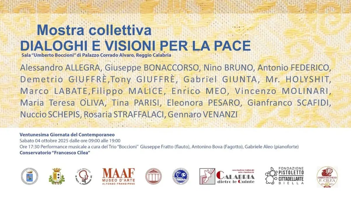 In occasione della XXI Giornata del Contemporaneo promossa da AMACI (Associazione Musei d’Arte Contemporanea Italiani), si apre oggi a Palazzo Corrado Alvaro, nella Sala Boccioni, la mostra collettiva “Dialoghi e Visioni per la Pace”, visitabile fino alla mattina del 6 ottobre.