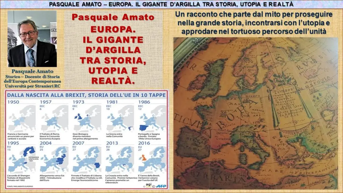 Il saggio "Europa, il gigante d’argilla tra storia, utopia e realtà" del professore Pasquale Amato - pubblicato nel Blog "Pasquale Amato Storico" con un esito di quasi due milioni di visualizzazioni - offre un'analisi profonda del continente, descrivendolo come un caleidoscopio culturale in costante tensione tra unità e nazionalismi. L'opera critica la natura economica dell'attuale Unione Europea, definendola un "gigante d'argilla" privo di una solida anima politica e strategica.