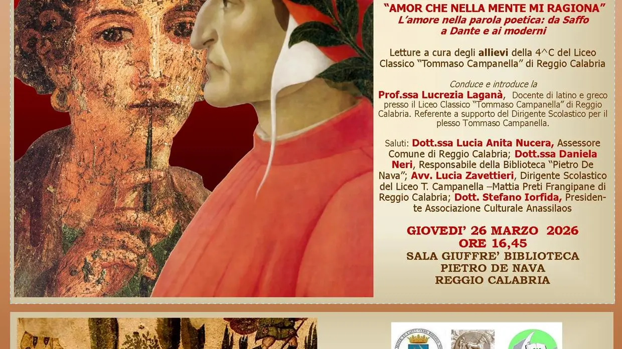In occasione della Giornata Mondiale della Poesia 2026 si terrà giovedì 26 marzo alle ore 16,45 presso la Sala Giuffrè della Biblioteca “Pietro De Nava” un incontro sul tema “Amor che nella mente mi ragiona”. L’amore nella parola poetica: da Saffo a Dante e ai moderni con letture a cura degli allievi della 4^C del Liceo Classico “Tommaso Campanella” di Reggio Calabria, evento promosso congiuntamente dall’Associazione Anassilaos, dallo stesso Liceo T. Campanella –Mattia Preti Frangipane di Reggio Calabria e dalla Biblioteca De Nava con il patrocinio del Comune. Dopo aver ospitato nel mese di gennaio gli studenti del Liceo Scientifico “Leonardo da Vinci” che hanno recitato testi di Catullo e Lucrezio con la partecipazione dei proff. Carmelo Cutrupi, Carmela Lucisano e Amos Martino, è ora la volta del Liceo Classico reggino con l’intervento della Prof.ssa Lucrezia Laganà, Docente di latino e greco presso il Liceo Classico “Tommaso Campanella” di Reggio Calabria e referente a supporto del Dirigente Scolastico per il plesso Tommaso Campanella. Il 16 aprile sarà invece la volta del Liceo Scientifico “Alessandro Volta” con la Prof.ssa Anna Maria Borrello. “La percezione dell’Antico” che l’Associazione Anassilaos segue e persegue da un certo numero di anni quale scoperta o riscoperta di una civiltà che tuttora caratterizza il nostro quotidiano – scrive Stefano Iorfida, Presidente del Sodalizio – ha intanto un senso se ci si rivolge alle più giovani generazioni sulle quali ricadrà la responsabilità di perdere o salvare un antichissimo retaggio depurato, alla luce della nostra sensibilità cristiana, dei pur numerosi aspetti problematici. Da qui l’incontro con le scuole e gli studenti chiamati ad essere non spettatori passivi ma protagonisti, insieme ai loro docenti, di incontri culturali. La manifestazione sarà aperta dai saluti della Dott.ssa Lucia Anita Nucera, Assessore al Comune di Reggio Calabria; della Dott.ssa Daniela Neri, Responsabile della Biblioteca “Pietro De Nava”, dell’ Avv. Lucia Zavettieri, Dirigente Scolastico del Liceo T. Campanella –Mattia Preti Frangipane di Reggio Calabria. Il giorno successivo, venerdì 27 marzo, alle ore 17,00, presso il Salone dei Lampadari “Italo Falcomatà” di Palazzo San Giorgio nell’ambito di un incontro promosso dall’Associazione Anassilaos e dal CIS Calabria la Prof.ssa Gilda Mastrorosa, Associato di Storia romana presso il Dipartimento di Storia, Archeologia, Geografia, Arte, Spettacolo (SAGAS) dell’Università di Firenze, terrà una lezione sul tema “Sguardi tardo-antichi sulla natura e la campagna: declinazioni del benessere e dell’emotività”. Interverrà la Prof.ssa Lucietta Di Paola, già Professore Associato di Storia Romana e di Istituzioni e Società nell’antica Roma, Università di Messina e Direttore della rivista “Il Maurolico”. Interverranno con un breve saluto Lucia Anita Nucera, Assessore Comune di Reggio Calabria; Loreley Rosita Borruto, Presidente CIS Calabria; Stefano Iorfida, Presidente Associazione Culturale Anassilaos. Alla studiosa sarà consegnato il Premio Anassilaos 2025 non ritirato nel mese di novembre.