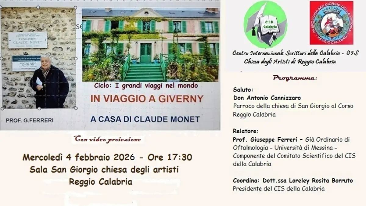 Nell’ambito del ciclo di incontri: Viaggi nel Mondo, il Centro Internazionale Scrittori della Calabria, con la collaborazione della Chiesa degli Artisti di Reggio Calabria, nella Sala San Giorgio della stessa chiesa, alle ore 17:30 di mercoledì 4 febbraio 2026, promuove l’incontro “In viaggio a Giverny, a casa di Claude Monet”.