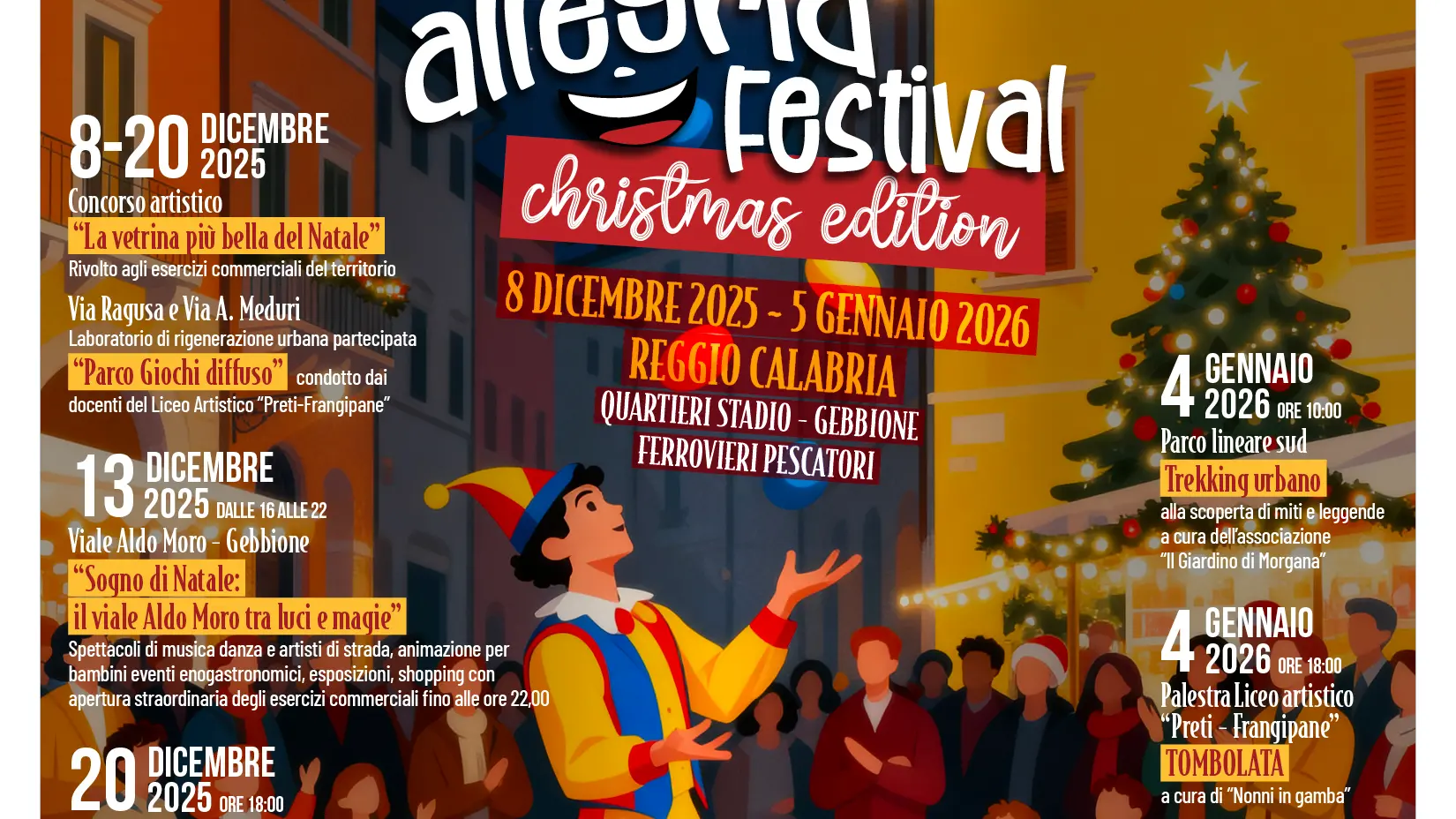 Ritorna l’edizione Christmas della manifestazione artistica e culturale “Allegria Festival” organizzata e promossa dall’Associazione culturale arte e spettacolo “Calabria dietro le quinte – APS”, con la direzione artistica di Giuseppe Mazzacuva e sostenuta dall’Avviso “Natale nel quartieri 2025-2026” del Comune di Reggio Calabria - POC_RC I.3.1.e.
