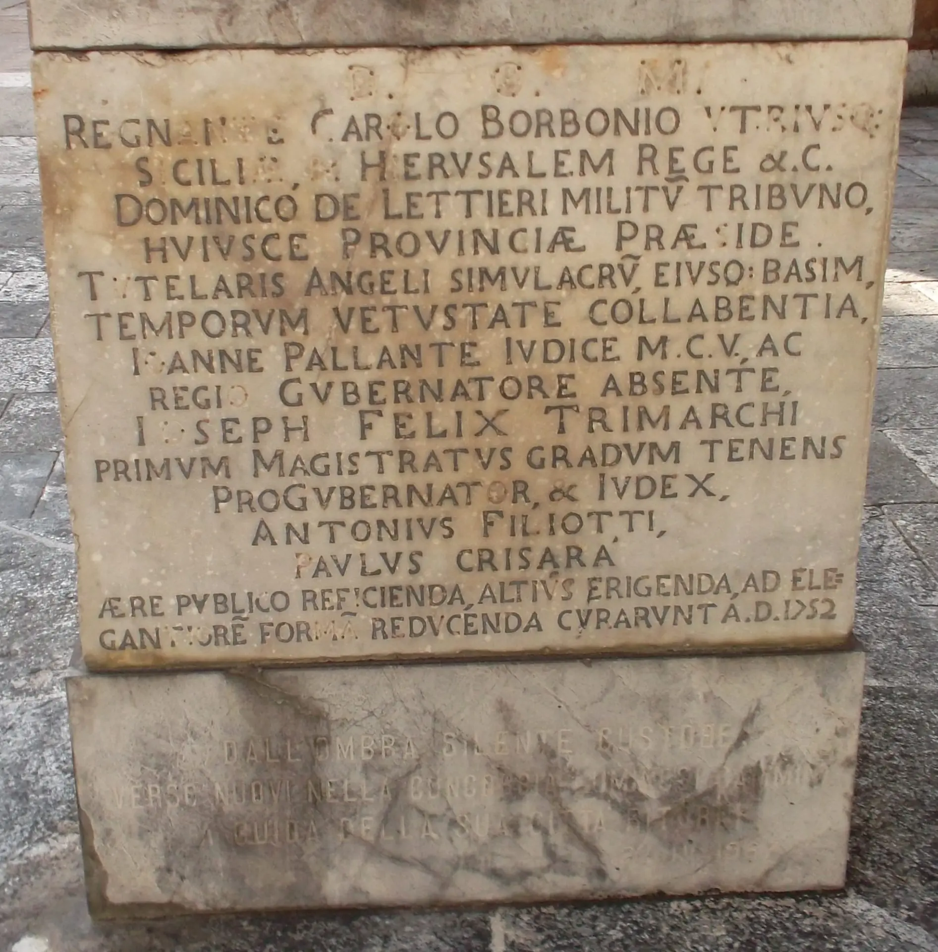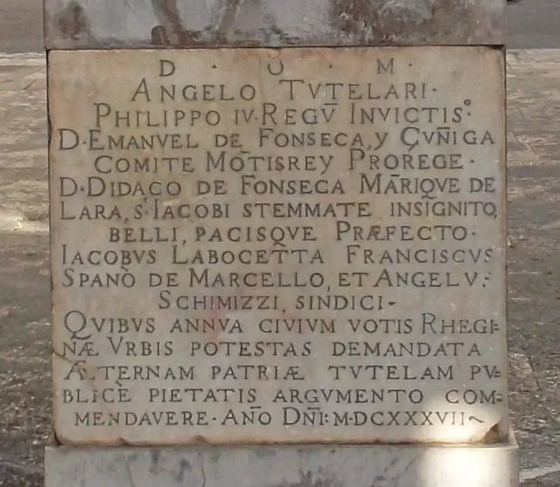 Lapide, peraltro, che racconta una pagina di storia cittadina, riportando i nomi del vicerè del Regno di Napoli, Manuel de Acevedo y Zúñiga conte di Monterrey; del governatore spagnolo Diego De Fonseca Manriquez; dei tre Sindaci eletti dalla cittadinanza, Giacomo Labocetta, Francesco Spanò ed Angelo Schimizzi. Dal 1637 la statua dell’Angelo Tutelare ha subìto diverse vicende. Possiamo fare riferimento ad una seconda lapide, che narra di un restauro avvenuto nel 1752.