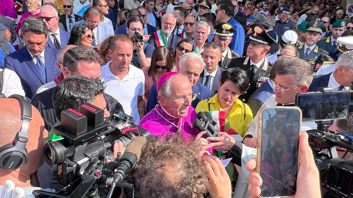 Maria viene incontro a noi per dirci “Ma volete una vita più dignitosa, più corretta, più decorosa, più dignitosa, dunque lecita?”. Sì, certamente che la vogliamo. Vogliamo più lavoro? Certamente sì. E allora noi diciamo “ci devono pensare i nostri amministratori, loro devono darci il pane”. Questo è sbagliato! È sbagliato! Loro ci aiutano a trovare il pane. Quel pane frutto del sudore della nostra fronte e non del sudore della fronte altrui, altrimenti, cari fratelli e sorelle, se questa non accade quello che stiamo per compiere è una passeggiata non una processione. A volte qualcuno tra di voi mi ricorda: “lei è nostro padre”, Bene faccio il padre, in nome del Signore. Quello che vi dico certamente non riguarda voi, popolo reggino, o forse in parte. Ecco: non vorrei che questi quattro giorni fossero una parentesi, un’epicheia dicono gli esperti, un momento a parte della vita, un tiretto che si apre e poi si chiude. Passata la festa della Madonna chiudiamo e la vita riparte. E da dove riparte? Dal nulla perché noi siamo qui per far ripartire la vita secondo lo Spirito del Signore che ha trasformato Maria. Allora non vorrei che questo momento bellissimo, emotivo, forte, identitario, fosse – prendetemi con le pinze e cestinatemi subito – una bella “pera” che ci facciamo, e via con gli occhi insonnoliti, imbambolati, appannati e disorientati