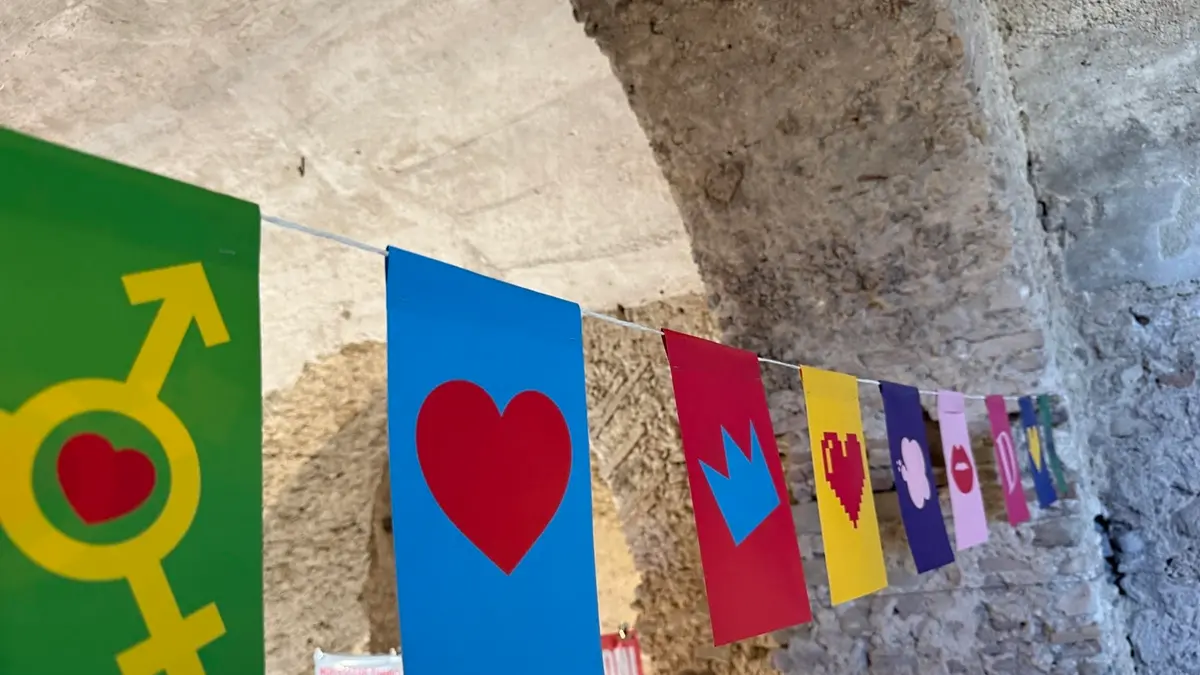 Tra t-shirt, mutandine da donna, gonfiabili da piscina, PVC e poster, il lessico scelto dall’artista è volutamente effimero, leggero, dissonante. E proprio per questo carico di senso. Un gioco visivo e concettuale che si scontra, o forse si sposa, con la solidità archeologica del luogo.