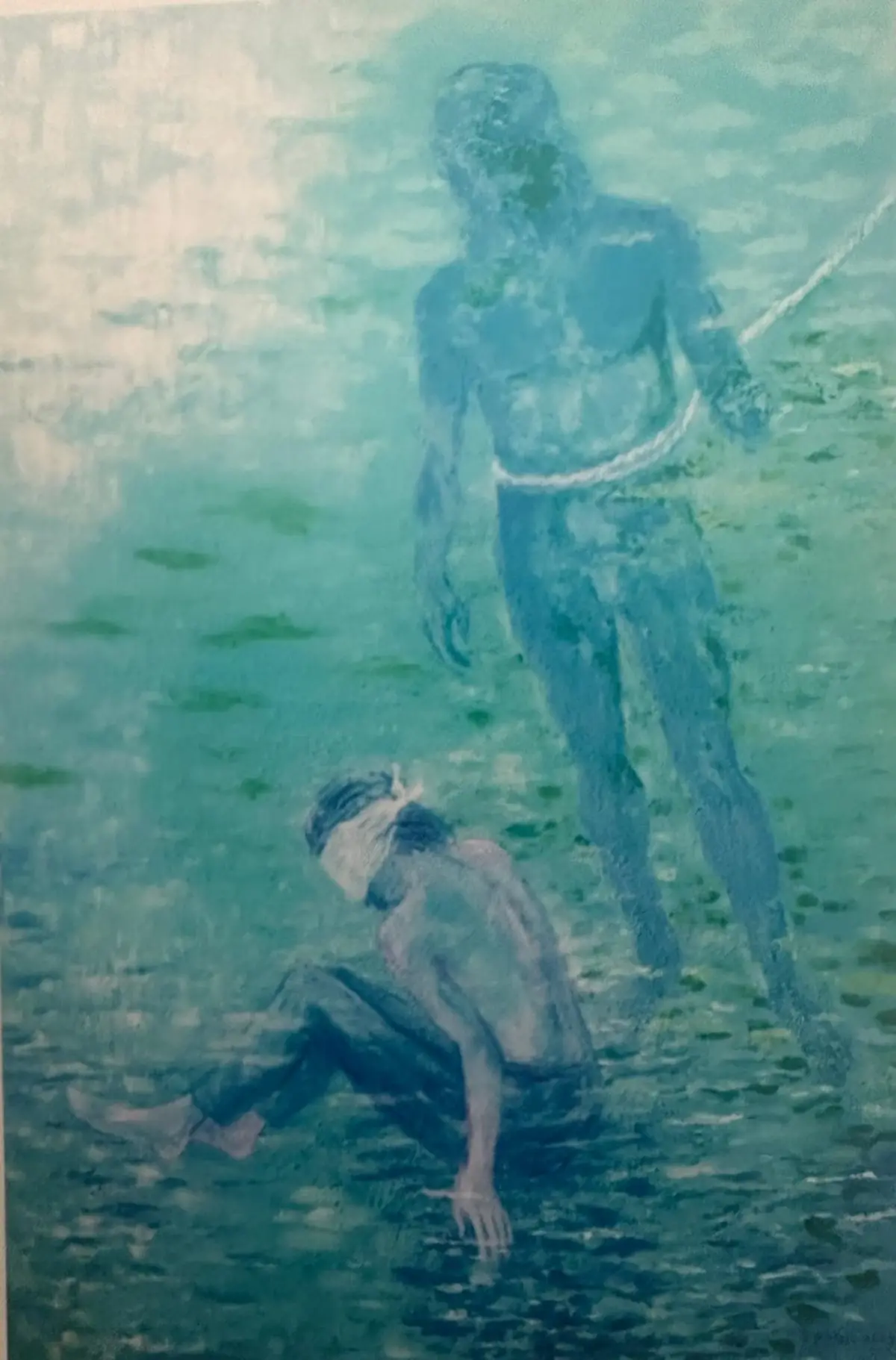«Mi sono interrogata su questo lasciando la risposta a chi vorrà immergersi in questi quadri perché, come diceva sempre mio marito, il maestro Ugo D’Ambrosi, noi dipingiamo. Il quadro ha poi vita a sé per chi e in chi vorrà guardarlo. Così un bronzo risale le acque verso la superficie mentre un giovane giace sul fondo, bendato. Una sorta di cecità psicologica – sottolinea ancora la pittrice Tina Parisi – di chi consegna la sua vita, o di genitori che consegnano la vita dei loro figli lasciati partire soli, ai trafficanti. Un gesto spinto dalla disperazione che quella soluzione sia comunque l’unica possibile». Ma forse in realtà la cecità non è la loro ma la nostra che non abbiamo bende ma che, molto più banalmente e irresponsabilmente, non guardiamo. Questo nuovo e suggestivo viaggio nell’arte, che si consacra grazie a Tina Parisi come viatico per scrutare la storia nella quale siamo immersi, di occhi potrebbe aprirne molti.