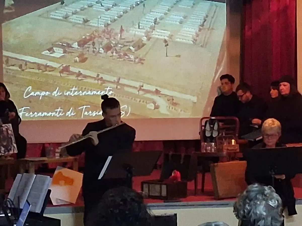 All'ingresso del Teatro una piccola mostra su cartelloni, di documenti e fotografie, anticipava quello che sarebbe stato l'argomento trattato: un pezzetto di storia calabrese intriso di ricordi e testimonianze a cura della professoressa Nunzia Rita Rizzi, nipote del Maresciallo di Pubblica Sicurezza Gaetano Marrari , Comandante del Campo. Il filmato , realizzato appositamente per l'occasione, ha messo in evidenza parecchi momenti di vita vissuti a Ferramonti. Le musiche eseguite egregiamente dal vivo (dal Mo Francesca Malacrinò e dal Mo Giuseppe Fratto) ei brani cantati dal Coro "Musica Nova" (diretto con grande professionalità dal Mo Alessandra Montenero) hanno creato una suggestiva atmosfera che predisponeva all'ascolto e alla meditazione.