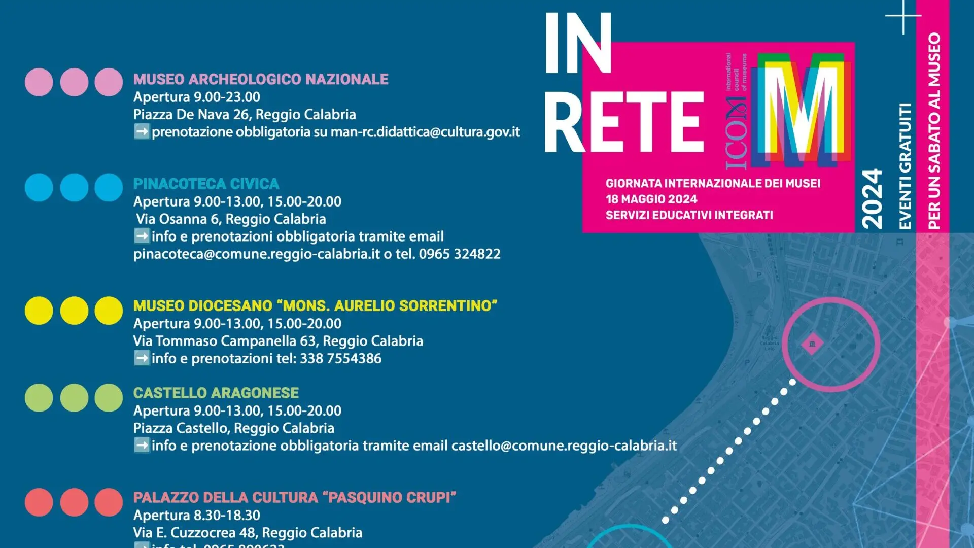Per la prima volta, le istituzioni culturali della Città di Reggio Calabria, impegnate nel campo museale ed espositivo, si uniranno in un’apertura sinergica e straordinaria. Infatti, il Museo Archeologico Nazionale di Reggio Calabria, il Museo Diocesano “Mons. Aurelio Sorrentino”, il Palazzo della Cultura “Pasquino Crupi” della Città Metropolitana di Reggio Calabria e la Fondazione del Piccolo Museo San Paolo, la Pinacoteca Civica e il Castello Aragonese della Città di Reggio Calabria, il Museo d’arte Alfonso Frangipane si uniscono in rete per offrire una serie di attività ed avvicinare i bambini, i ragazzi e gli adulti all’arte, all’archeologia e al mondo museale attraverso laboratori, giochi e attività creative, oltre che visite guidate gratuite.