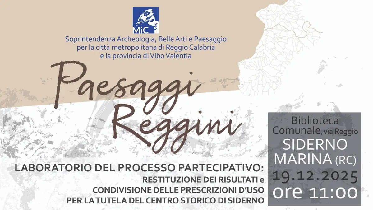 La restituzione dei risultati del processo partecipativo avviato a inizio anno nell’ambito del progetto “Paesaggi Reggini”, promosso dal Comune di Siderno e dalla Soprintendenza Abap per la Città Metropolitana di Reggio Calabria e la Provincia di Vibo Valentia, e la condivisione delle prescrizioni d’uso per la tutela del centro storico di Siderno ai sensi del Codice dei Beni Culturali e del Paesaggio.