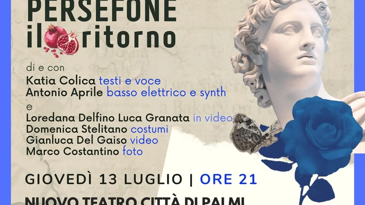 Sarà “Persefone – Il ritorno” a rappresentare il Balenando in Burrasca Reading Festival al Nuovo Teatro Città di Palmi, realizzando l’ultima tappa dedicata alla letteratura in performance reading della sua quarta edizione. Giovedì 13 luglio ore 21, nei nuovi locali della cittadina calabrese, andrà in scena lo spettacolo ispirato alla mitologia della dea Persefone, figlia di Demetra, rapita da Ade e divenuta regina degli Inferi. L’appuntamento è organizzato in collaborazione con l’Associazione Adexo, promotrice del festival. In scena Katia Colica, voce e testi, con le musiche di Antonio Aprile e le incursioni in video di Luca Granata e Loredana Delfino. I costumi sono a cura di Domenica Stelitano, video e foto di Gianluca Del Gaiso e Marco Costantino.