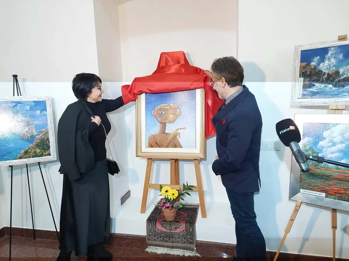 A inaugurare la mostra, sabato scorso, una madrina d’eccezione, Daniela Rambaldi, figlia del tre volte premio Oscar per gli effetti speciali Carlo Rambaldi, omaggiata dall’artista con un quadro raffigurante E.T., l’extraterrestre cinematografico che valse al padre la terza statuetta, nel 1982, dopo le precedenti ottenute nel 1976 per King Kong e nel 1979 per Alien.