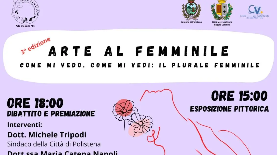 L’8 marzo 2025, a partire dalle ore 15.00, presso il Salone delle feste del Comune di Polistena (R.C.), Via G. Lombardi, si terrà l’evento “Arte al femminile”, costituito dal concorso pittorico con annessa esposizione delle opere dei partecipanti e il dibattito “COME MI VEDO, COME MI VEDI: IL FEMMINILE PLURALE”, organizzato dall’Associazione Arte che parla APS, con il patrocinio del Comune di Polistena, della Città Metropolitana di Reggio Calabria, e del CSV – Centro servizi per il volontariato “I Due Mari” di Reggio Calabria.