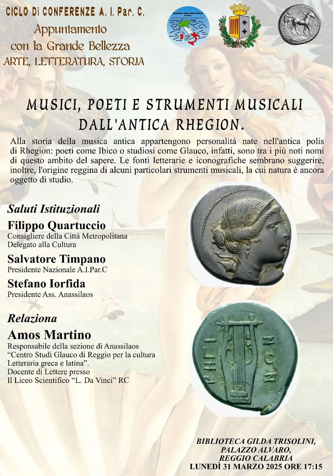 Lunedì 31 marzo 2025, alle ore 17:15 presso Palazzo Alvaro, Biblioteca Gilda Trisolini per il ciclo di conferenze “Appuntamento con la Grande Bellezza. Arte, Letteratura, Storia” ideato dal Presidente nazionale A.I.Par.C. dott. Salvatore Timpano, e realizzato in collaborazione con la Città Metropolitana di Reggio Calabria e con l’Associazione Culturale Anassilaos, si terrà l’incontro su: “Musici, poeti e strumenti musicali dall’antica Rhegion.”