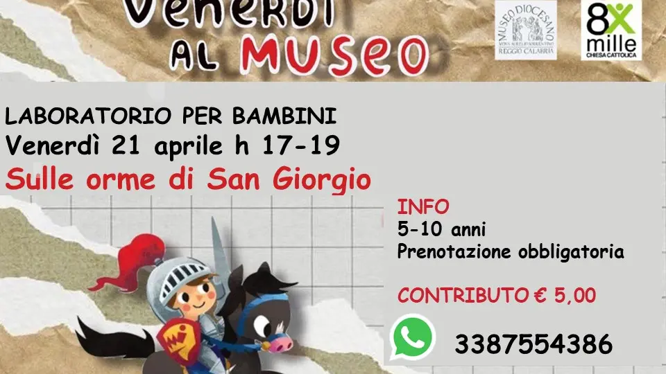 Venerdì 21 aprile laboratorio didattico per bambini dedicato a San Giorgio Continuano a riscuotere successo al Museo diocesano di Reggio Calabria i laboratori didattici per bambini (5-10 anni) riservati alle famiglie: da febbraio a maggio, un venerdì al mese, dedicati a un tema sempre diverso.