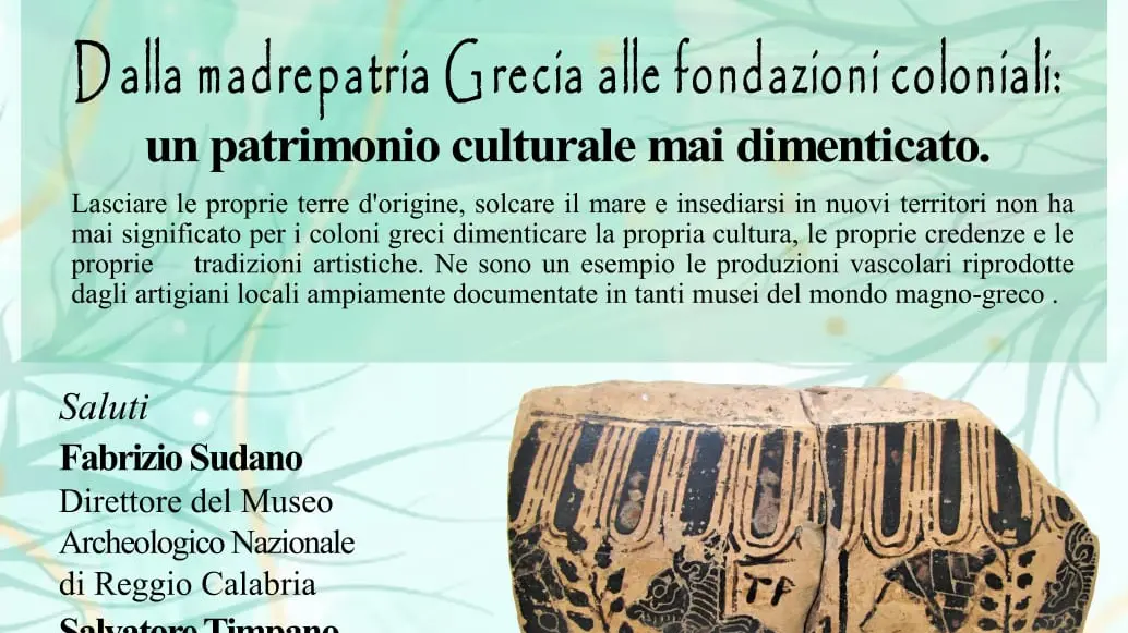 Sala Conferenze, alle ore 17:30, nell’ambito della prima edizione del ciclo di conferenze “Radici”, finalizzato alla promozione e valorizzazione delle fondamenta della cultura nella prospettiva di unire fatti del passato e del presente, contribuendo anche ad inquadrare le vicende del prossimo futuro, ideato e coordinato dal presidente nazionale A.I.Par.C. dott.Salvatore Timpano, nell’ambito della convenzione stipulata con il Museo Archeologico Nazionale di Reggio Calabria, si terrà il secondo l’incontro, con ingresso gratuito, che avrà a tema: “Dalla madrepatria Grecia alle fondazioni coloniali: un patrimonio culturale mai dimenticato”.