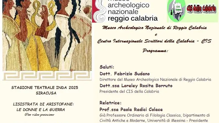 Promossa dal Museo Archeologico Nazionale di Reggio Calabria e dal Centro Internazionale Scrittori, mercoledì 19 febbraio, alle ore 17:30, nella sala conferenze del MArRC si svolgerà la conferenza “Lisistrata di Aristofane: le donne e la guerra”. Interverranno: il direttore del Museo, Fabrizio Sudano, e la presidente del Cis della Calabria, Loreley Rosita Borruto. Con il supporto di video proiezione relaziona Paola Radici Colace, già prof. Ordinario di Filologia classica, Dipartimento di Civiltà Antiche e Moderne dell’Università di Messina, presidente onorario, direttore scientifico e presidente della sezione antichistica del Cis della Calabria.