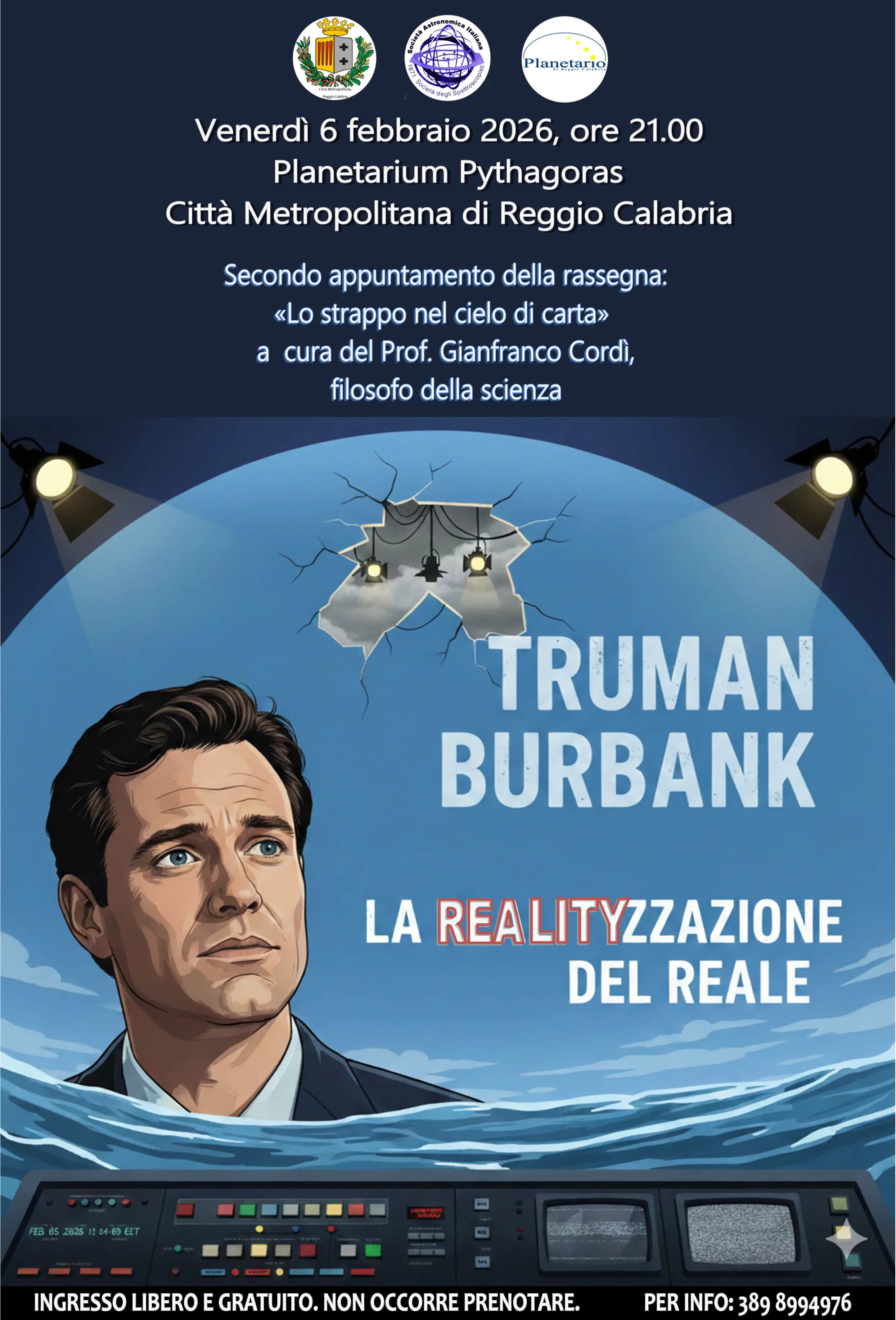 La vita di Truman prima è diventata una «favola» e, quindi, un «reality show». Ma che succederebbe se si venisse a creare uno «strappo nel cielo di carta» delle scenografie televisive? A guidare la riflessione sarà il professor Gianfranco Cordì, filosofo appartenente alla corrente del Nuovo Realismo fondata dallo stesso Ferraris.