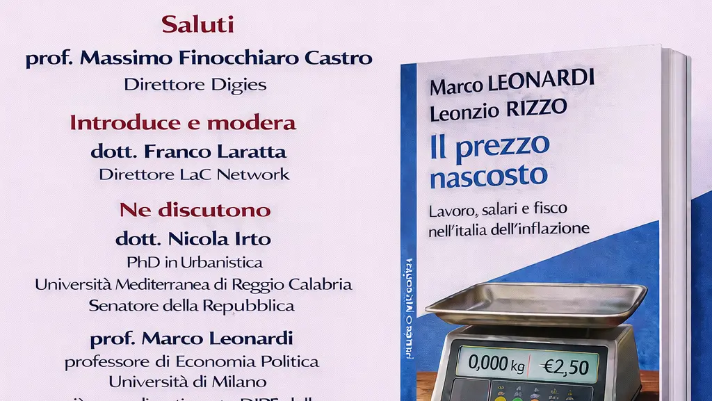 L’Università Mediterranea di Reggio Calabria – Dipartimento Giurisprudenza, Economia e Scienze Umane (DiGiES) – promuove la presentazione del volume Il prezzo nascosto. Lavoro, salari e fisco nell’Italia dell’inflazione (Egea, 2026) di Marco Leonardi e Leonzio Rizzo. L’incontro si terrà lunedì 16 febbraio 2026, alle ore 9.00, presso la Sala Consiglio (Lotto D).