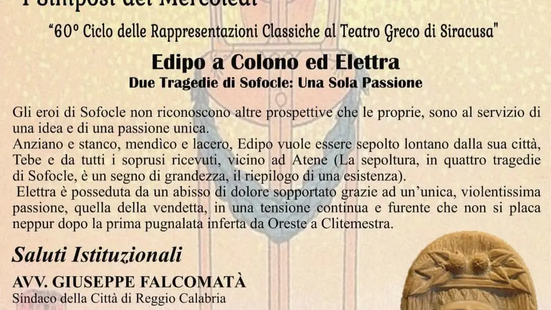 Mercoledì, 7 maggio 2025, alle ore 16:45 presso la Villetta De Nava, Sala Giuffrè,L’A.I.Par.C. in collaborazione con la Città di Reggio Calabria e la Biblioteca Pietro De Nava, nell’ambito del Ciclo di Incontri “I Simposi del Mercoledì” ideato dal Presidente nazionale A.I.Par.C. dott. Salvatore Timpano, in occasione del 60° Ciclo delle Rappresentazioni Classiche al Teatro Greco di Siracusa, presenta: “Edipo a Colono ed Elettra Due tragedie di Sofocle, Una sola Passione”