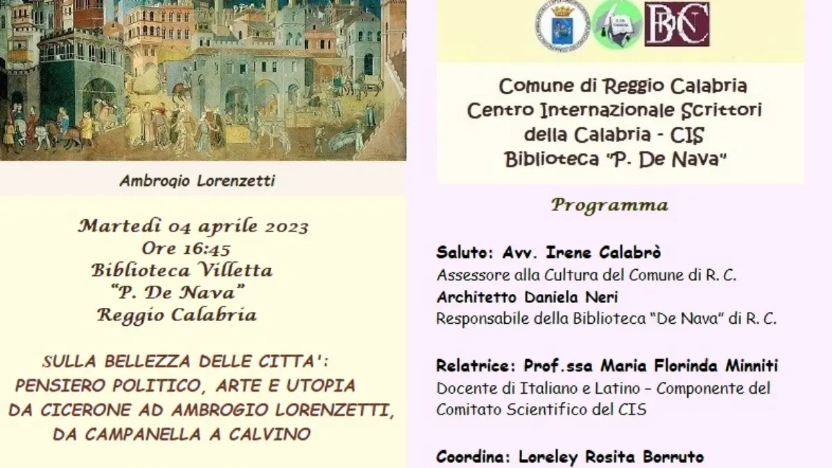 Martedì 4 aprile 2023, alle ore 16:45, alla Biblioteca Villetta “P. De Nava” di Reggio Calabria, il Comune di Reggio Calabria, il Centro Internazionale Scrittori della Calabria e la stessa Biblioteca promuovono l’incontro “Sulla bellezza delle città: pensiero politico, arte e utopia da Cicerone a Ambrogio Lorenzetti, da Campanella a Calvino”.