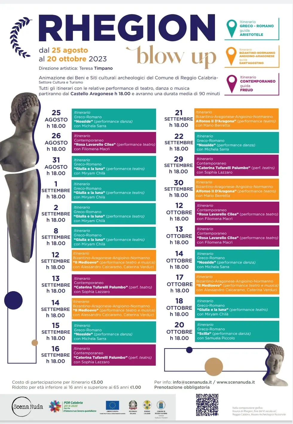 Da qualche giorno è iniziato il progetto Rhegion Blow Up, iniziativa che prevede l’ideazione e la realizzazione di itinerari turistico culturali innovativi e interattivi capaci di coinvolgere cittadini, turisti e appassionati, immergendoli direttamente all’interno del contesto culturale dei siti archeologici reggini. Complessivamente sono tre gli itinerari proposti dal programma disposto in sinergia con la compagnia Scena Nuda: quello greco romano, tra via Giulia, le Terme romane, le Mura greche, l’ipogeo di piazza Italia, l’Area Sacra Griso Laboccetta, l’Odeion ed il Teatro Cilea, che avrà come guida il personaggio di Aristotele, quello Bizantino Normanno Angioino Aragonese, tra la Chiesa di San Giorgio al Corso, il Castello Aragonese, la Chiesa degli Ottimati, via Giudecca ed il DUomo, che avrà come guida Sant’Agostino, e quello contemporaneo, tra Opera di Tresoldi, le statue di Rabarama, il Teatro Cilea, la Pinacoteca, la Galleria di Palazzo SAn Giorgio, la stele di Pascoli ed il Duomo, che avrà come guida Freud.
