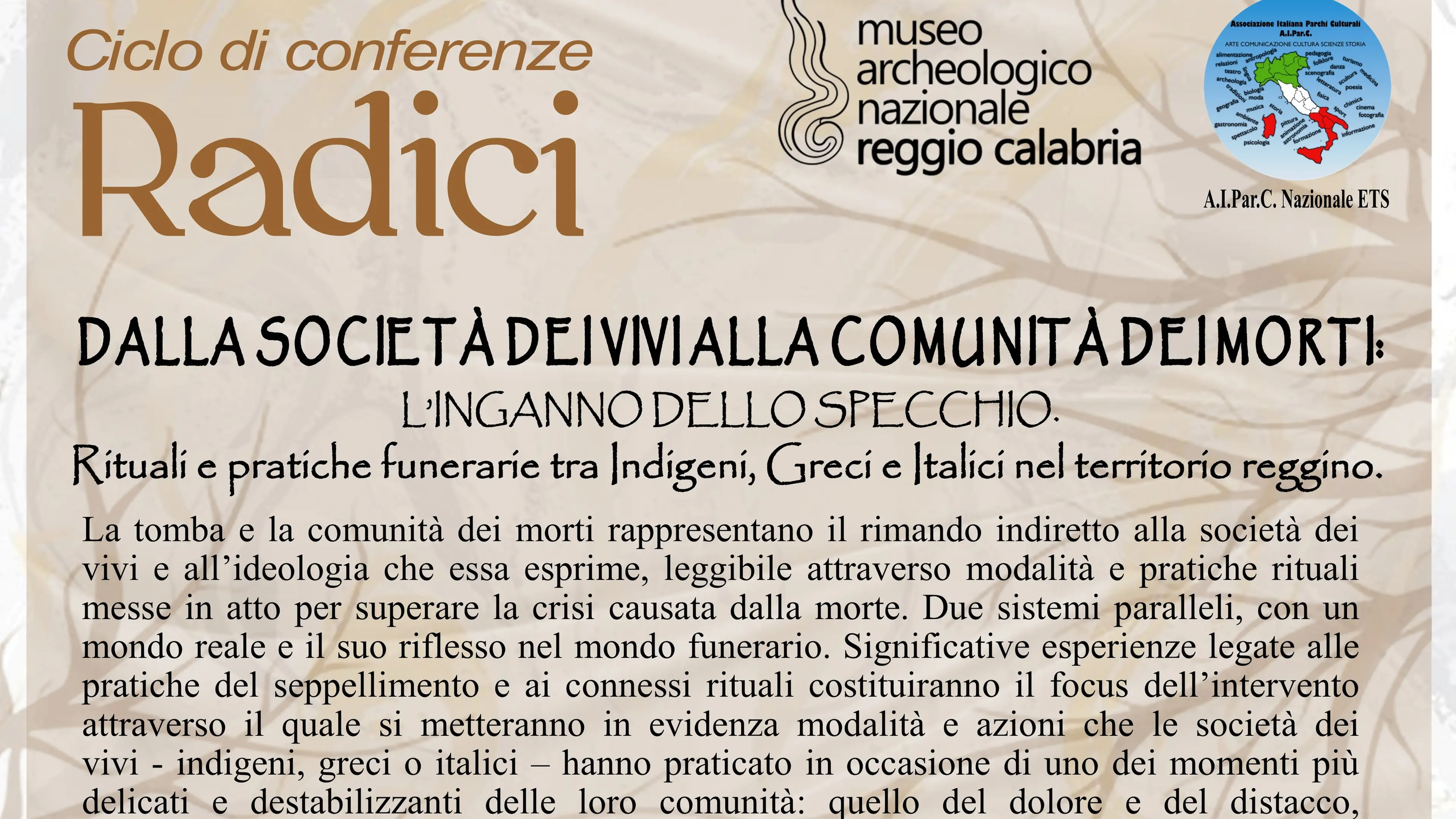 Mercoledi 17 dicembre alle ore 17:30, nella Sala Conferenze del Museo Archeologico Nazionale di Reggio Calabria, nell’ambito del ciclo di conferenze “Radici”, finalizzate alla promozione e valorizzazione delle fondamenta della cultura nella prospettiva di unire fatti del passato e del presente, contribuendo anche ad inquadrare le vicende del prossimo futuro, ideate e coordinate dal Presidente A.I.Par.C. Nazionale ETS Dott. Salvatore Timpano, nell’ambito della convenzione stipulata con il Museo Archeologico di Reggio Calabria, si terrà l’incontro : “Dalla società dei vivi alla comunità dei morti: l’inganno dello specchio. Rituali e pratiche funerarie tra indigeni, greci e italici nel territorio reggino”.