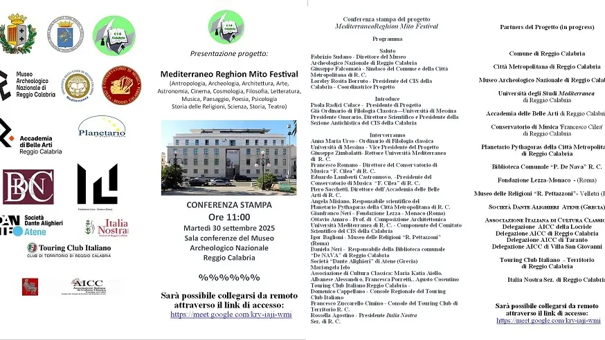 Martedì 30 settembre alle ore 11.00, presso la Sala conferenze del Museo Archeologico Nazionale di Reggio Calabria, alla presenza delle autorità presenti, dei Presidenti e rappresentanti delle Istituzioni e Associazioni che hanno aderito al progetto, organi di stampa e informazioni si terrà la conferenza stampa di presentazione del progetto: “Mediterraneo Reghion Mito Festival”.