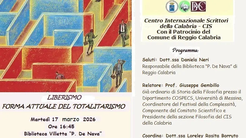 Martedì 17 marzo 2026, alle ore 16:45 presso la Biblioteca Villetta “P. De Nava” di Reggio Calabria, il Centro Internazionale Scrittori della Calabria – CIS, con il patrocinio del comune di Reggio Calabria, organizza la conferenza “Liberismo, forma attuale del totalitarismo”. Dopo i saluti di rito di Daniela Neri, responsabile della Biblioteca “P. De Nava”, e di Loreley Rosita Borruto, presidente del Cis della Calabria, con il contributo di slides relaziona Giuseppe Gembillo, già ordinario di Storia della Filosofia presso il Dipartimento COSPECS, Università di Messina, Coordinatore del Festival della Complessità, Componente del Comitato Scientifico e Presidente della sezione Filosofia del CIS della Calabria. Il liberismo, in alcune sue forme contemporanee, può assumere caratteristiche che ricordano forme di controllo e di concentrazione del potere economico e sociale, portando a una situazione che alcuni definiscono come una nuova forma di totalitarismo. Infatti la concentrazione di potere economico, le disuguaglianze sociali e la sempre crescente erosione della sovranità democratica limitano il ruolo del potere delle democrazie nazionali e delle istituzioni pubbliche.
