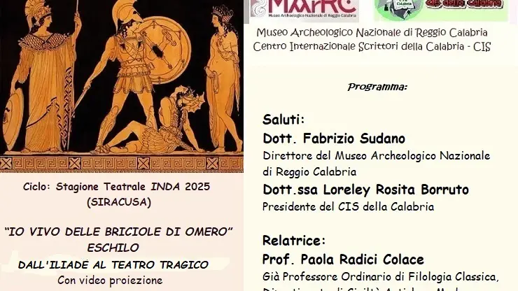 Mercoledì 7 maggio 2025, alle ore 17.30, presso il Museo Archeologico Nazionale di Reggio Calabria, lo stesso Museo e il Centro Internazionale Scrittori della Calabria, promuovono la conferenza “Io vivo delle briciole di Omero”. Eschilo dall’Iliade al Teatro Tragico”. Introducono l’incontro: Fabrizio Sudano, Direttore del Museo Archeologico Nazionale di Reggio Calabria, e Loreley Rosita Borruto, presidente del Cis della Calabria. Con il supporto di slides relaziona Paola Radici Colace, prof. Ordinario di Filologia classica – Dipartimento di Civiltà Antiche e Moderne dell’Università di Messina, presidente onorario, direttore scientifico e presidente della sezione Antichistica del Cis. Eschilo, considerato il padre della tragedia greca, ha compiuto un percorso dalla narrazione epica dell’Iliade alla creazione di opere teatrali tragiche.