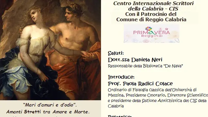 Martedì 10 giugno 2025, alle ore 16:45 presso la Biblioteca Villetta “P. De Nava” di Reggio Calabria, nell’ambito della “Primavera Reggina 2025”, il Centro Internazionale Scrittori della Calabria (CIS), con il patrocinio del comune di Reggio Calabria, promuove la conferenza: “Mari d’amuri e d’odio”. Amanti Stretti tra Amore e Morte. Una traversata nel tempo tra mito e letteratura.