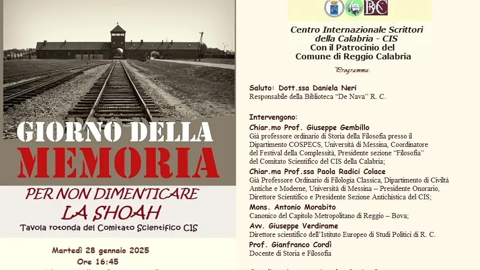 Il Centro Internazionale Scrittori della Calabria, con il patrocinio del comune di Reggio Calabria, per tentare di comprendere un evento terrificante e ricordare i genocidi perpetrati dai soldati tedeschi, martedì 28 gennaio 2025 alle ore 16:45, presso la Biblioteca Villetta “p. De Nava” di Reggio Calabria, promuove la tavola rotonda: “Giorno della memoria 2025, per non dimenticare la Shoah”. Dopo i saluti di rito di Daniela Neri, responsabile della Biblioteca “De Nava”, e di Loreley Rosita Borruto, presidente del Cis della Calabria, intervengono alla tavola rotonda: Giuseppe Gembillo, già professore ordinario di Storia della Filosofia presso il Dipartimento COSPECS, Università di Messina, Coordinatore del Festival della Complessità, Presidente sezione “Filosofia” del Comitato Scientifico del CIS della Calabria; Paola Radici Colace, già Professore Ordinario di Filologia Classica, Dipartimento di Civiltà Antiche e Moderne, Università di Messina – Presidente Onorario, Direttore Scientifico e Presidente Sezione Antichistica del CIS della Calabria; Mons. Antonio Morabito, Canonico del Capitolo Metropolitano di Reggio – Bova; Giuseppe Verdirame, Direttore scientifico dell’Istituto Europeo di Studi Politici di Reggio Calabria; Gianfranco Cordì, Docente di Storia e Filosofia.