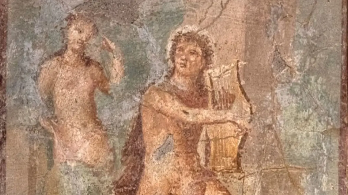 Tra le opere esposte c’è il magnifico affresco raffigurante Apollo e Dafne, realizzato a Pompei tra il 62 e il 79 d.C., pochi anni prima della disastrosa eruzione del Vesuvio. Il dipinto proviene dalla parete ovest del peristilio della casa di Meleagro, dove era affiancato da altri dipinti a tema amoroso (esposti al Museo Archeologico Nazionale di Napoli). La scena è ambientata all’aperto. Al centro si riconosce Apollo, giovane e imberbe, poggiato a un pilastro. Il dio è seminudo, con un mantello rosso che dalle spalle scende sulla coscia sinistra. La testa, contornata da un suggestivo nimbo luminoso, mostra
