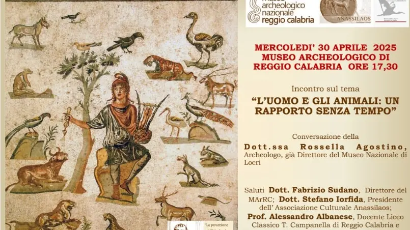 “L’uomo e gli animali: un rapporto senza tempo” è il tema della conversazione che la Dott.ssa Rossella Agostino , Archeologo e già Direttore del Museo Nazionale di Locri, terrà mercoledì 30 aprile alle ore 17,30 presso la Sala del Museo Archeologico Nazionale di Reggio Calabria nell’ambito degli incontri promossi congiuntamente dallo stesso Museo Archeologico e dall’Associazione Culturale Anassilaos con l’adesione e la partecipazione della Sezione Ibico Reggio Calabria dell’Associazione Italiana di Cultura Classica (AICC) nell’ambito della “Percezione dell’Antico” che da qualche anno caratterizza la ricerca del Sodalizio reggino.