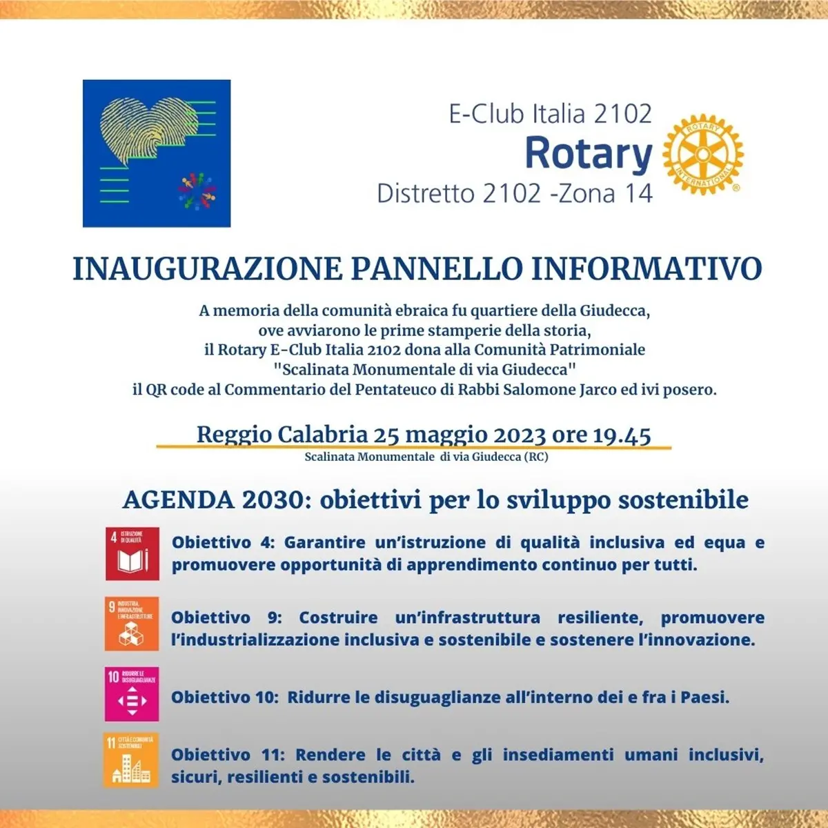 L’inaugurazione dell’installazione del pannello informativo e QR-code del Pentateuco, donato dal Rotary E-Club Italia 2102, è prevista per le 19:45 presso la Scalinata monumentale di via Giudecca alla presenza del suo presidente Luigi De Maio e della intera Comunità Patrimoniale.