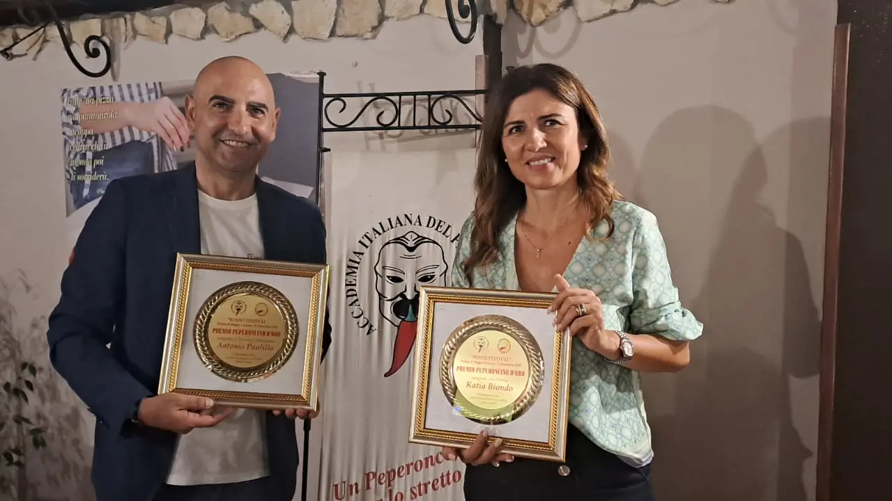 Dopo l’ennesimo rinvio dovuto alle cattive condizioni atmosferiche, che non hanno consentito di svolgere l’evento a borgo Nocille, in una nota pizzeria del Pellarese, c’è stata la cerimonia di consegna del Premio Peperoncino d’oro 2023, giunto all’undicesima edizione, ideato dalla delegazione Un peperoncino per lo stretto, aderente all’Accademia Italiana del Peperoncino. Sono stati insigniti del riconoscimento , nato per promuovere una Calabria “onesta e capace”, Antonio Paolillo (tecnologo alimentare,tra l’altro autore del libro dedicato al caciocavallo di Ciminà) e Katia Biondo (pittrice e artista, ideatrice della linea Sciuri, oggettistica per eventi). Erano presenti, oltre ad amici e parenti dei premiati, i consiglieri della delegazione accademica, Francesca Alampi, Alfonso Canale, Angelo Latella e Nino Alampi, il presidente Sergio Ribecco e il vice presidente Fortunato Pennestri’. Nella foto i due premiati.