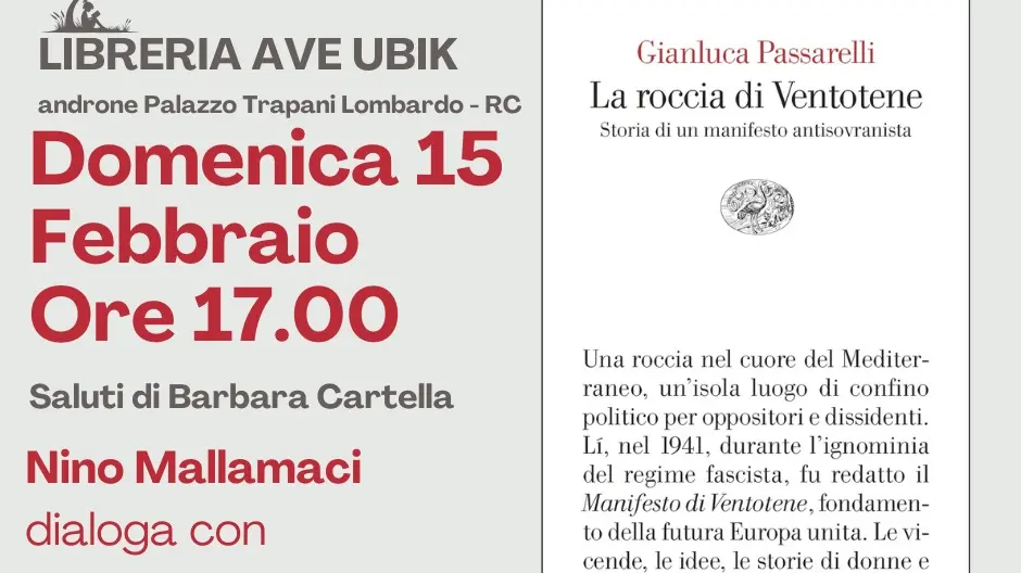 La Strada è lieta di invitare la cittadinanza alla presentazione del volume “La roccia di Ventotene” di Gianluca Passarelli, in programma presso la libreria Ave Ubik, nell’androne Trapani Lombardo, a Reggio Calabria, domenica 15 febbraio alle ore 17:00.